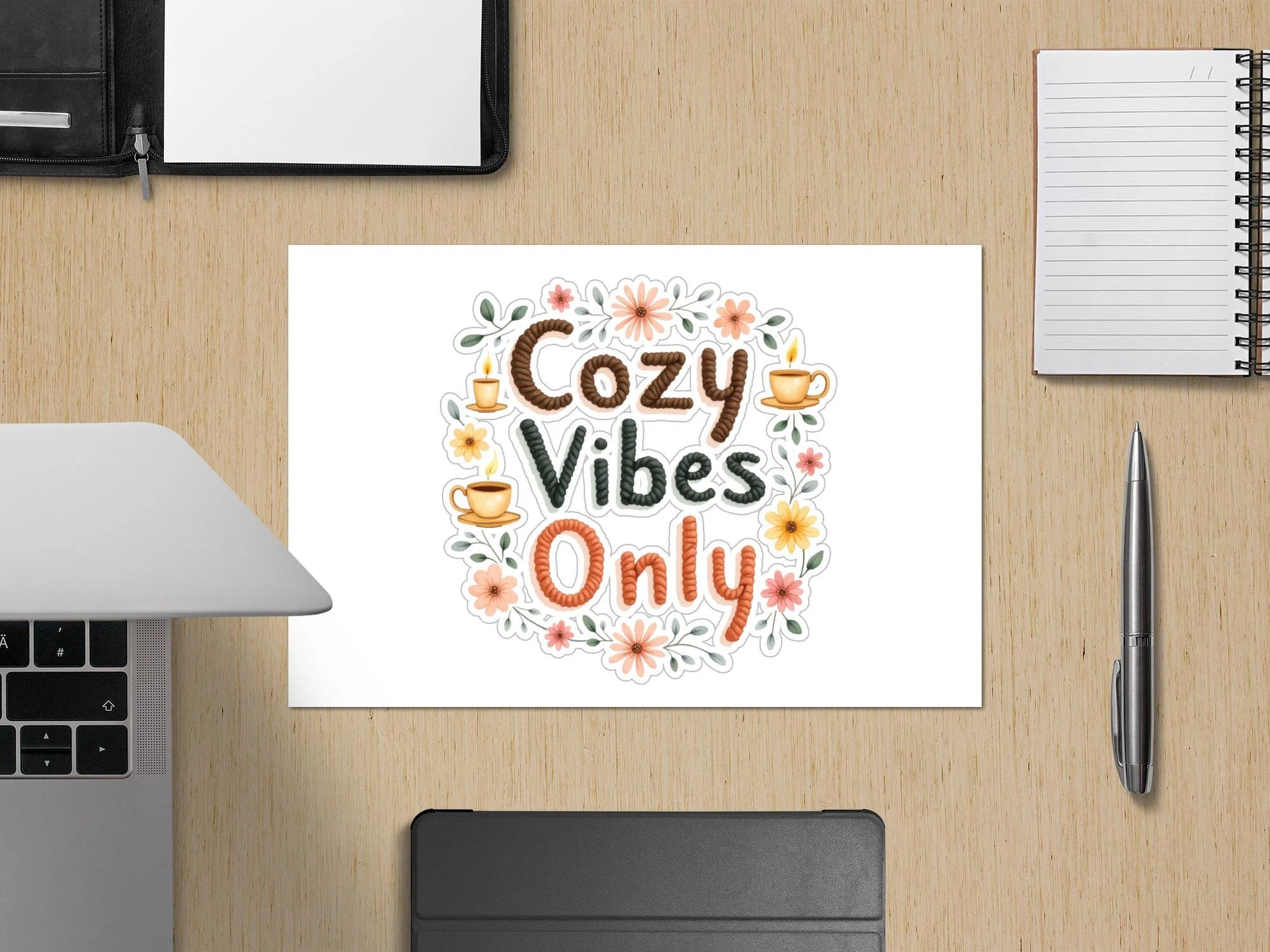 Design includes coffee and pencils.