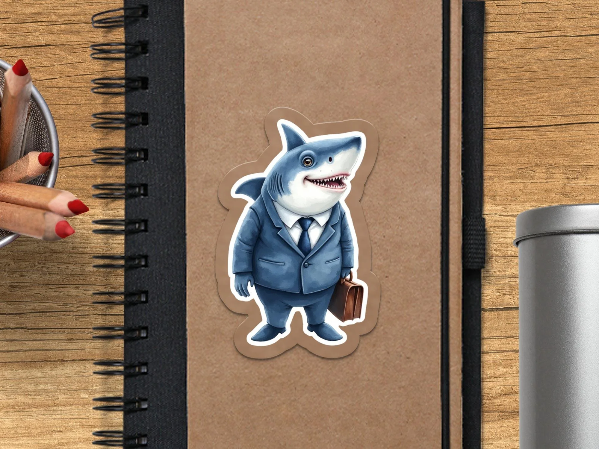 This unique sticker is great for personalizing your belongings. It presents a shark character in business attire. He is holding a brown briefcase. The design has a fun and whimsical feel. Perfect for adding a lighthearted touch. Great for laptops, water bottles, and notebooks. A unique and eye catching design for all. Ideal for marine life fans and business humor lovers.