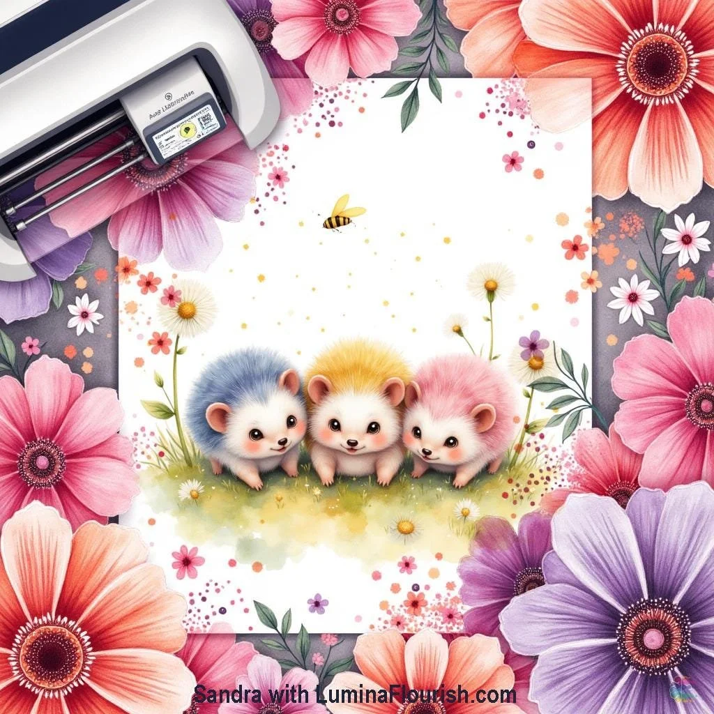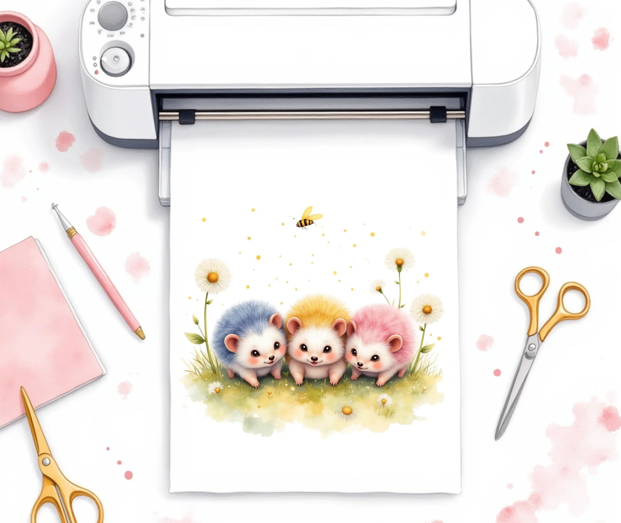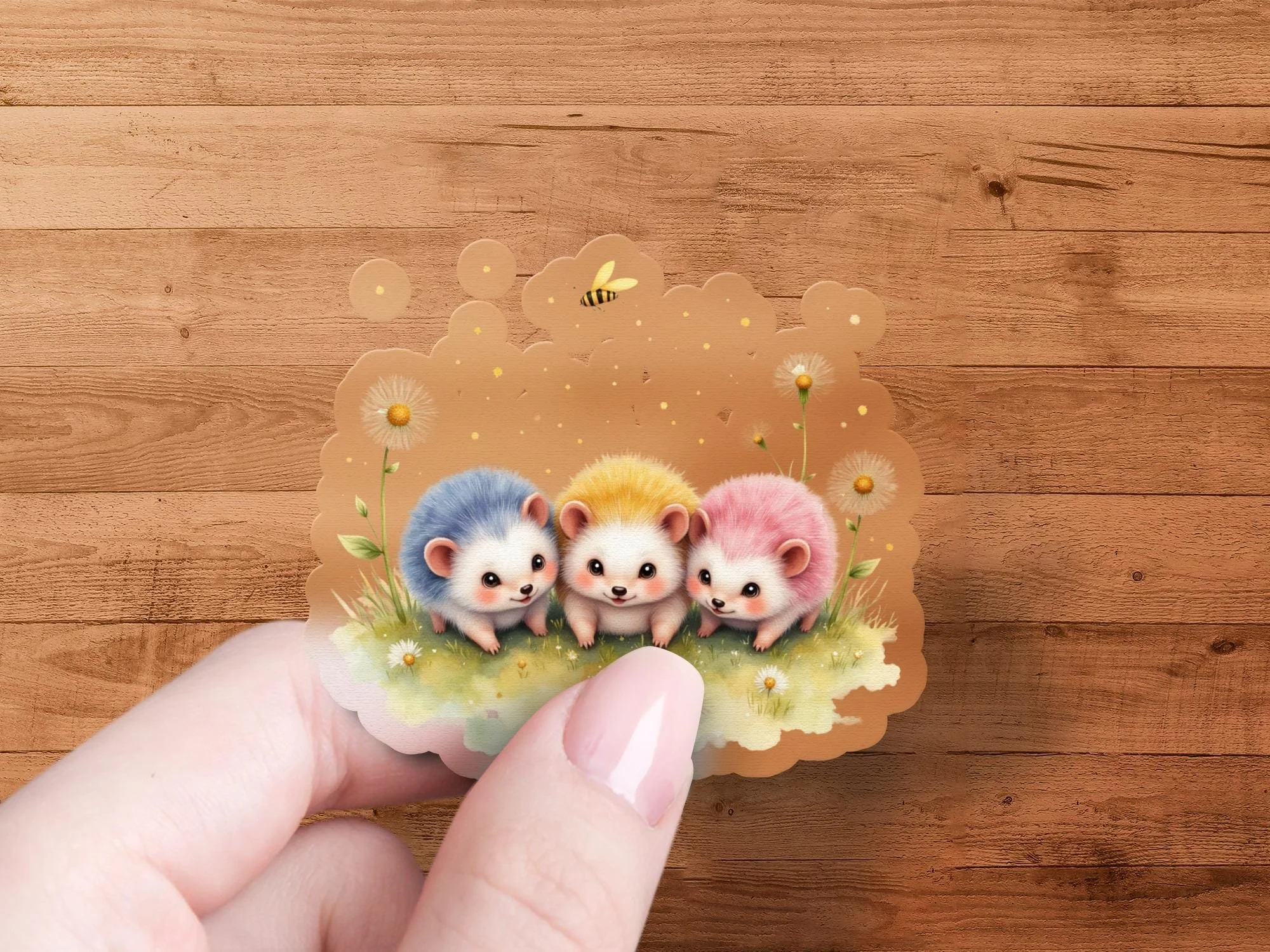 Add a touch of whimsical charm to your belongings with this adorable hedgehog sticker. This delightful design features three cute hedgehogs in pastel colors, surrounded by delicate flowers and a buzzing bee. Perfect for adding a playful and cheerful vibe to your everyday items. A unique and eye-catching design for all.