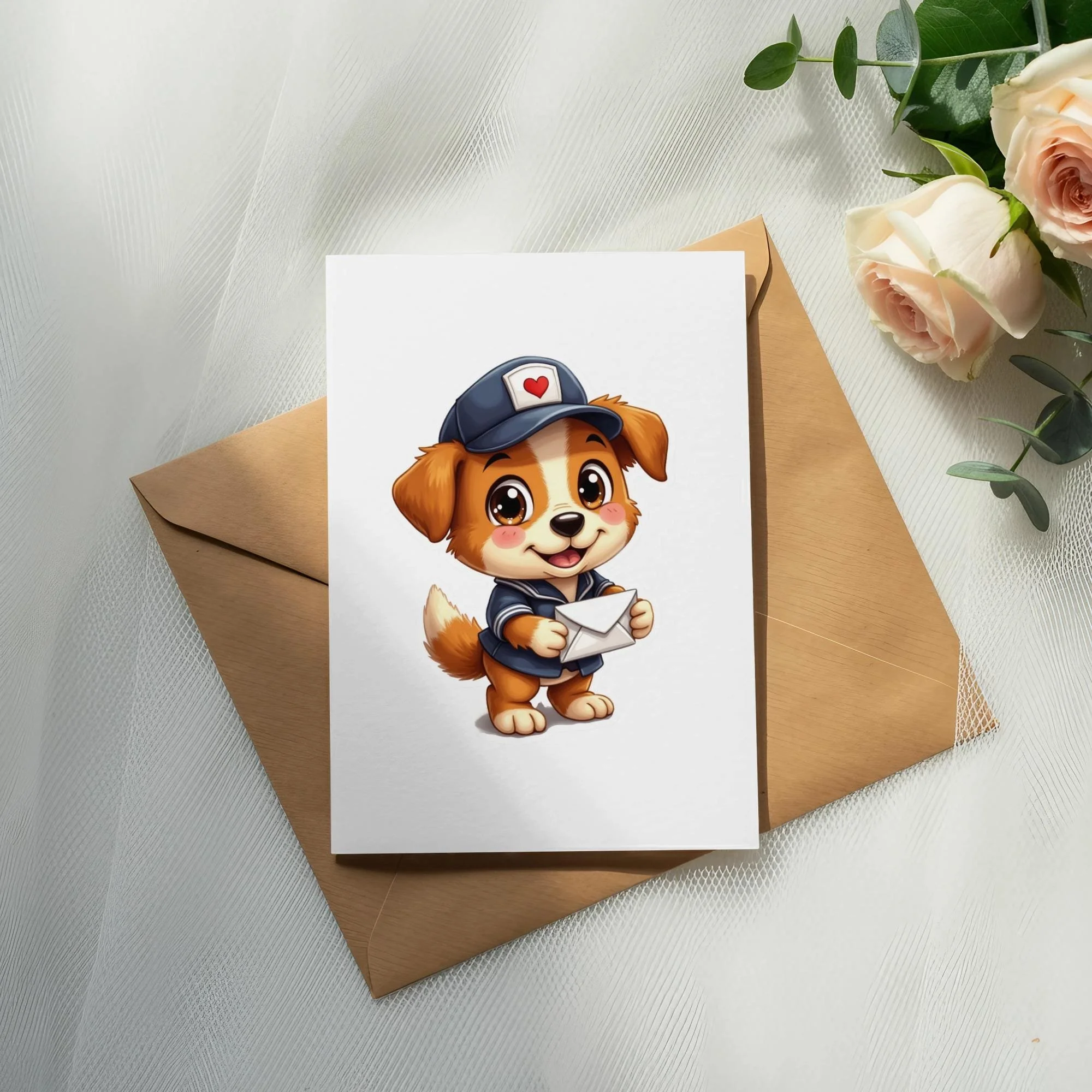 This unique sticker is perfect for personalizing your belongings. It features a cute cartoon dog in a mail carrier uniform. The dog is holding an envelope. The design is perfect for adding a touch of sweetness to any item. Perfect for laptops, water bottles, and notebooks. A unique and eye catching design for all. Ideal gift for dog or mail themed lovers.