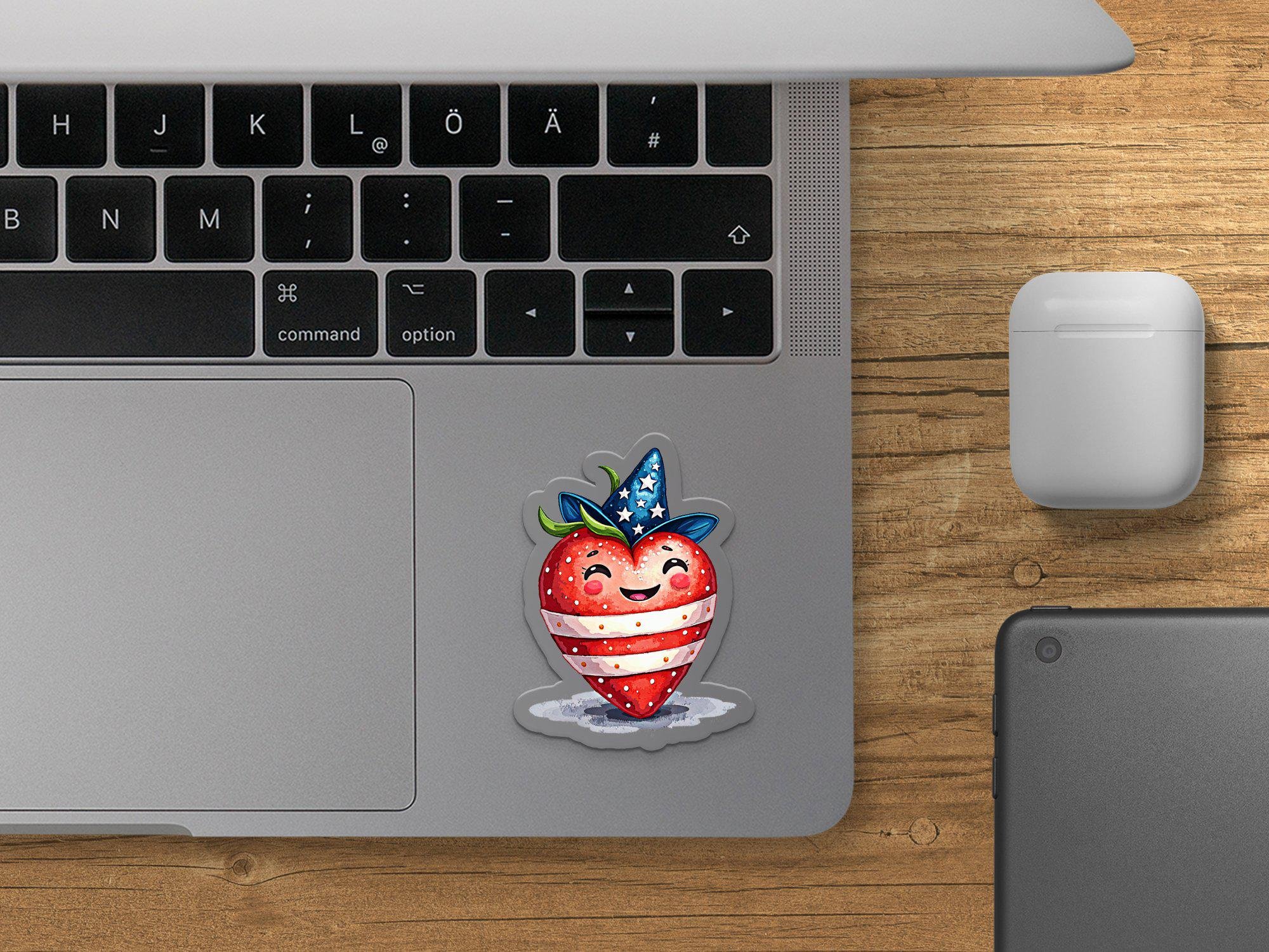 This cute patriotic strawberry sticker features an adorable fruit design with an American flag pattern. Ideal for decorating various surfaces, it makes a unique and fun gift idea suitable for all ages. Brighten up your items with this charming and colorful sticker!