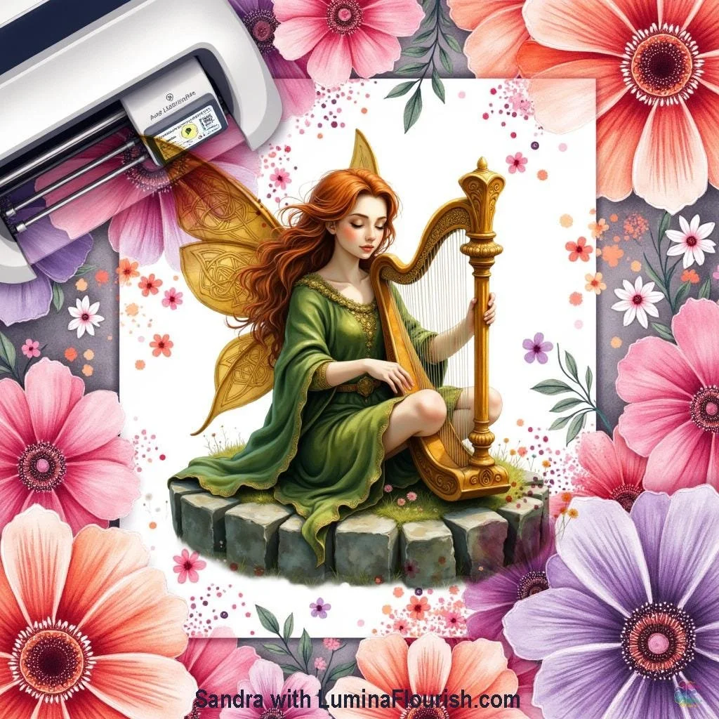 Fairy Harpist Sticker, Celtic Wings, Red Hair, Magical Sticker, Cottagecore Art, Whimsical Decor, Fantasy Art, Gift Idea, Laptop Decal