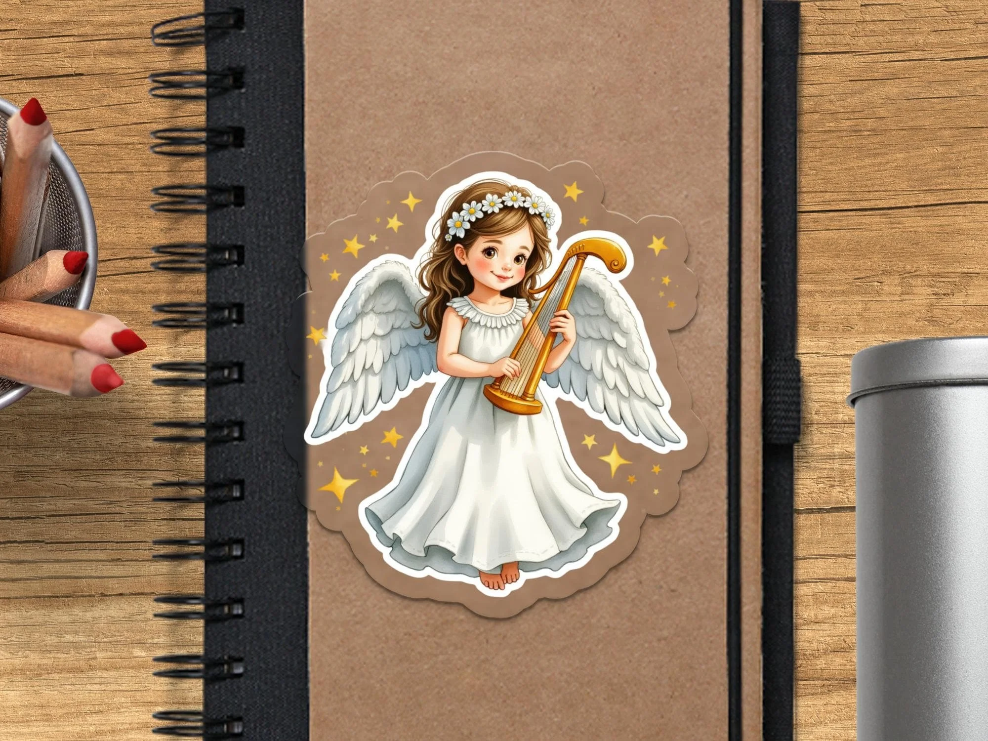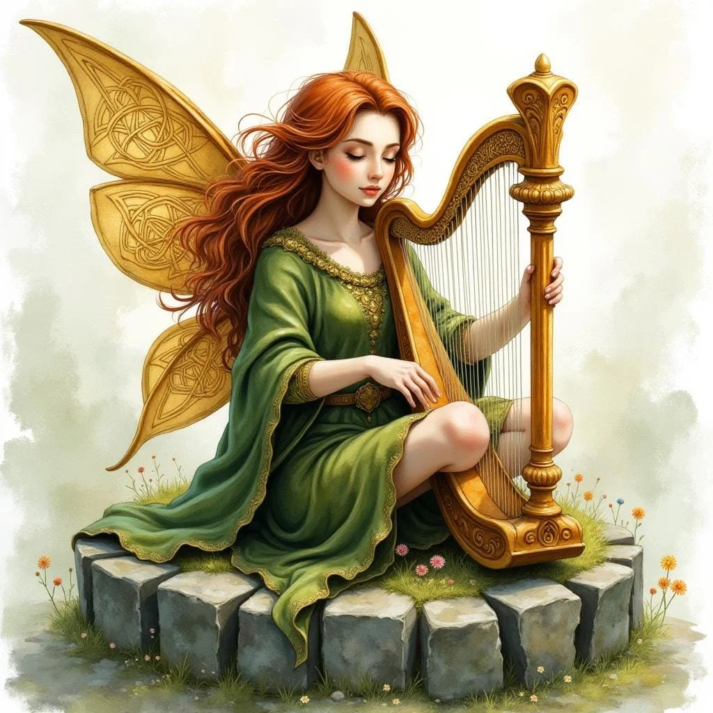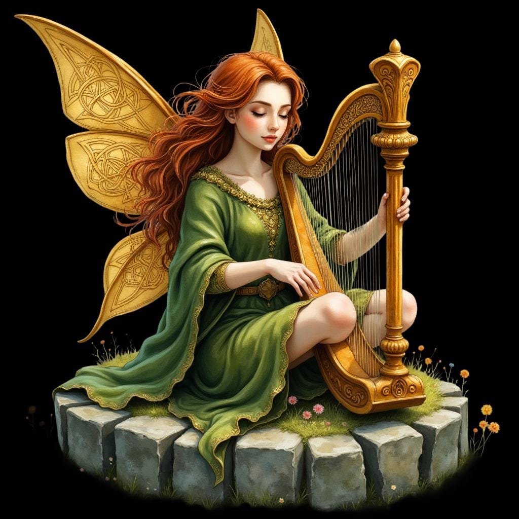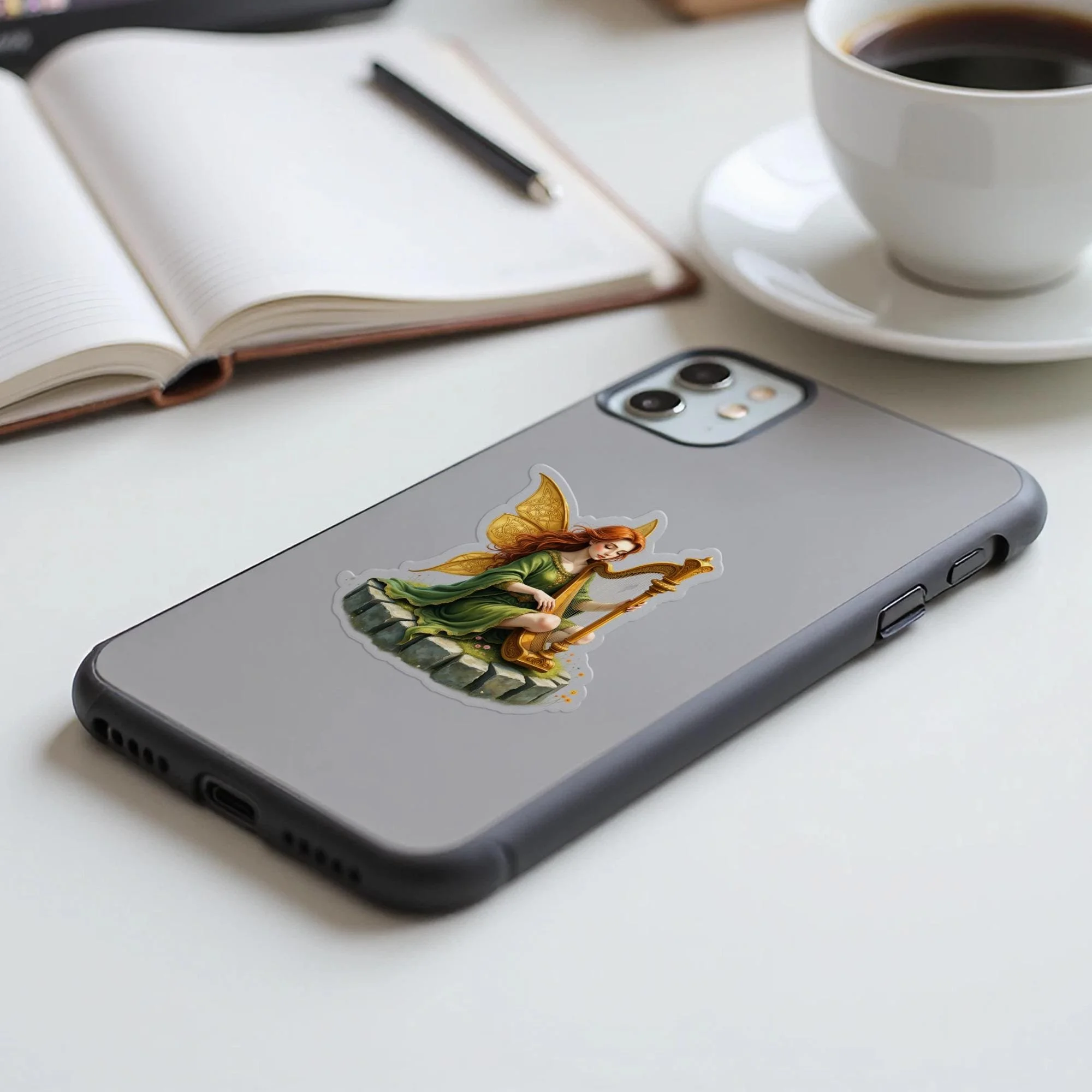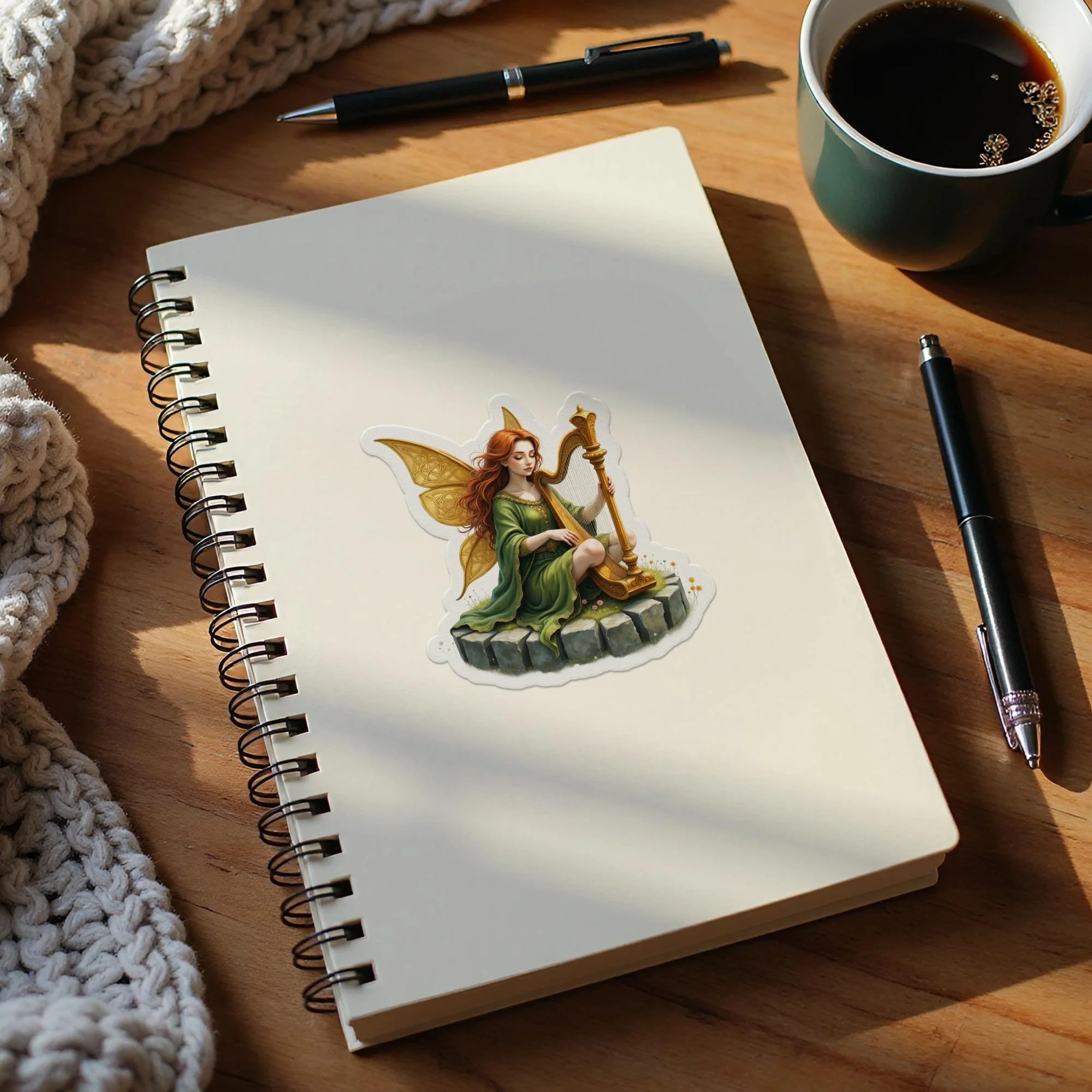 Elevate your everyday items with this enchanting "Fairy Harpist" sticker. This sticker features a beautiful fairy with striking red hair and intricate Celtic-inspired wings, gracefully playing a golden harp. The fairy is adorned in a flowing green dress, adding to the mystical allure of the design. Perfect for adding a touch of magic and whimsy to your belongings.