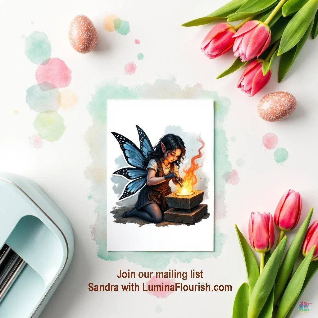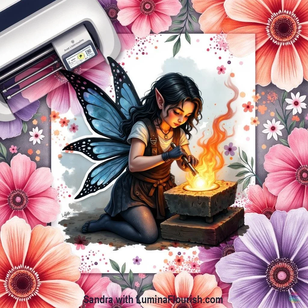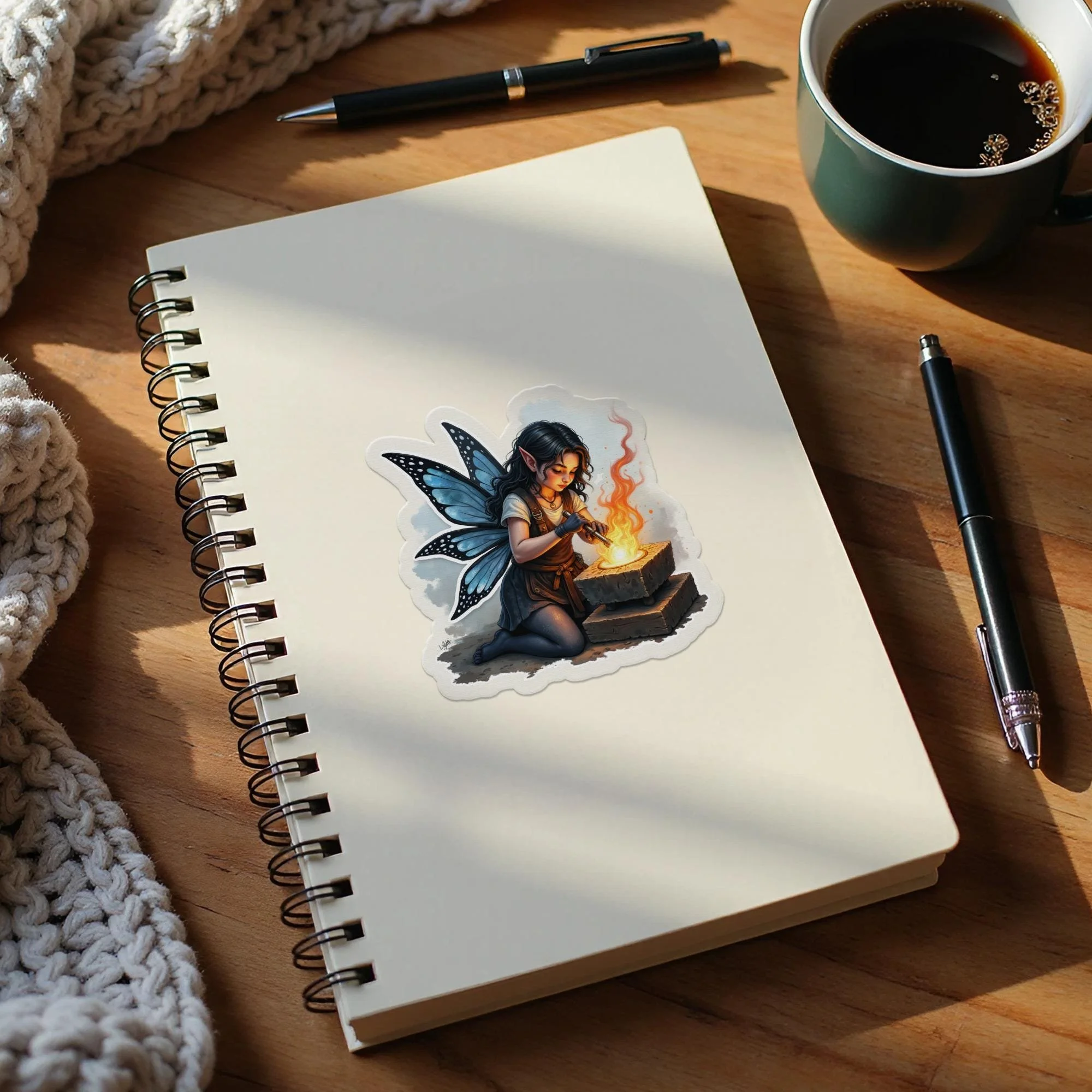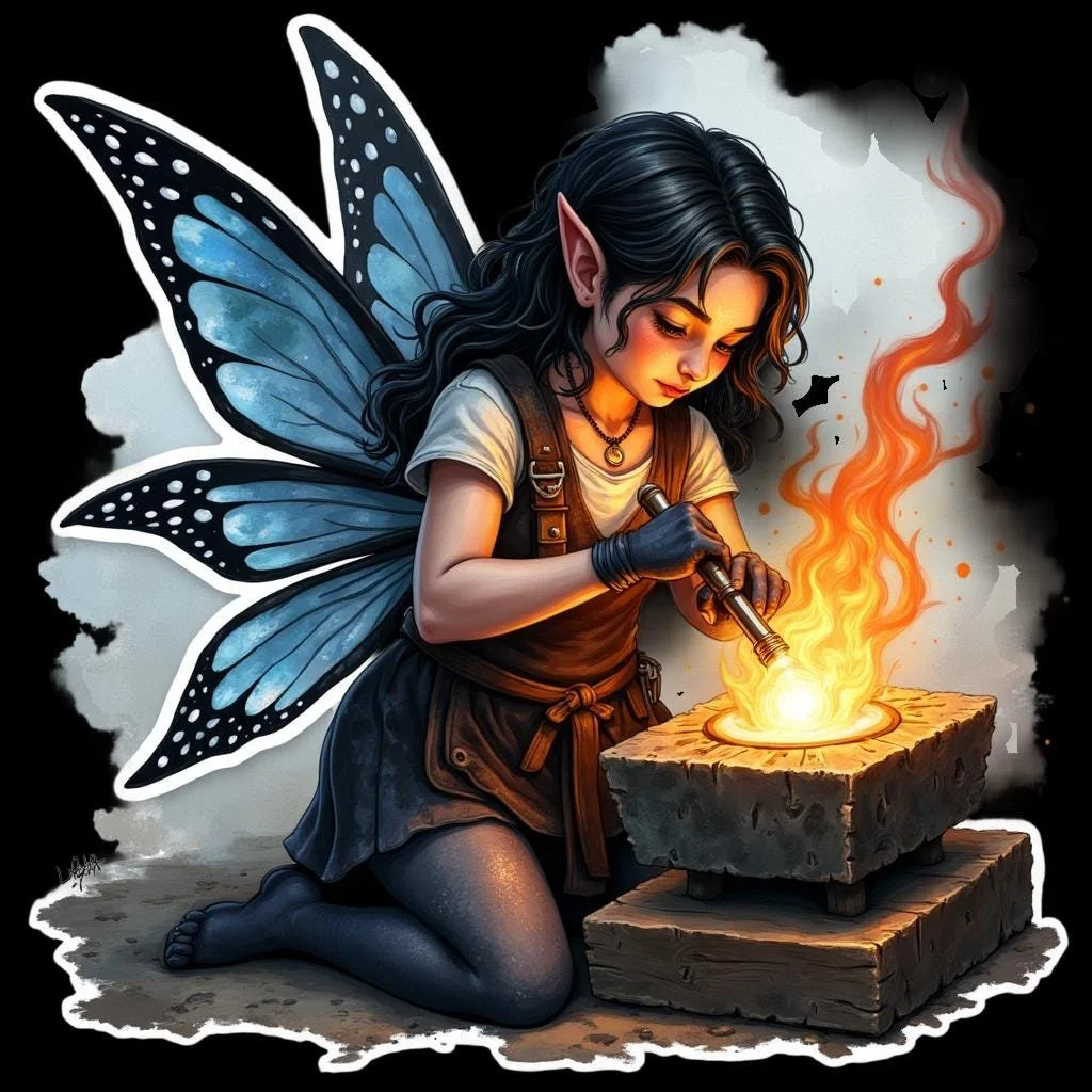 This unique sticker is perfect for adding a touch of fantasy to your belongings. It features a beautifully rendered fairy blacksmith design. The fairy has stunning blue butterfly wings and is focused on her craft. This enchanting image is sure to capture the imagination. Perfect for personalizing laptops, water bottles, notebooks, and more.