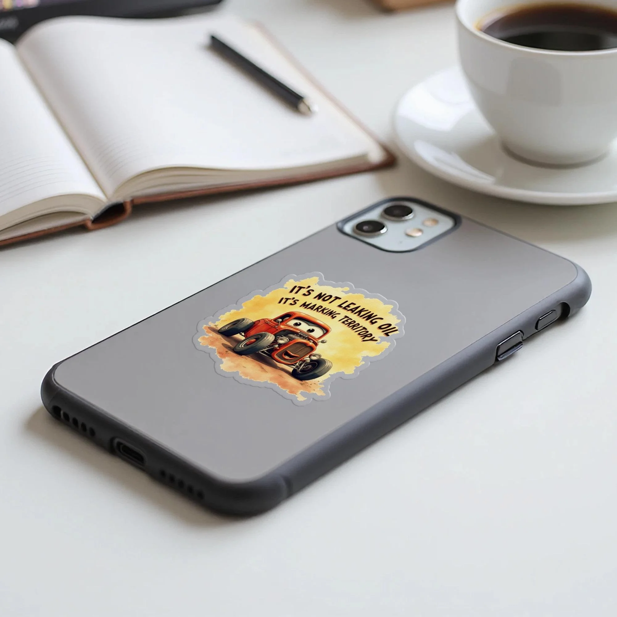 Add a touch of automotive humor to your belongings with this funny car sticker. Featuring a cartoon hot rod with the saying "It's not leaking oil, it's marking territory," this decal is sure to bring a smile to anyone's face. Perfect for car enthusiasts, mechanics, or anyone who appreciates a good laugh, this sticker is a great way to personalize your car, laptop, water bottle, or any other surface. This AI-assisted image sticker brings a unique and playful design to your collection.