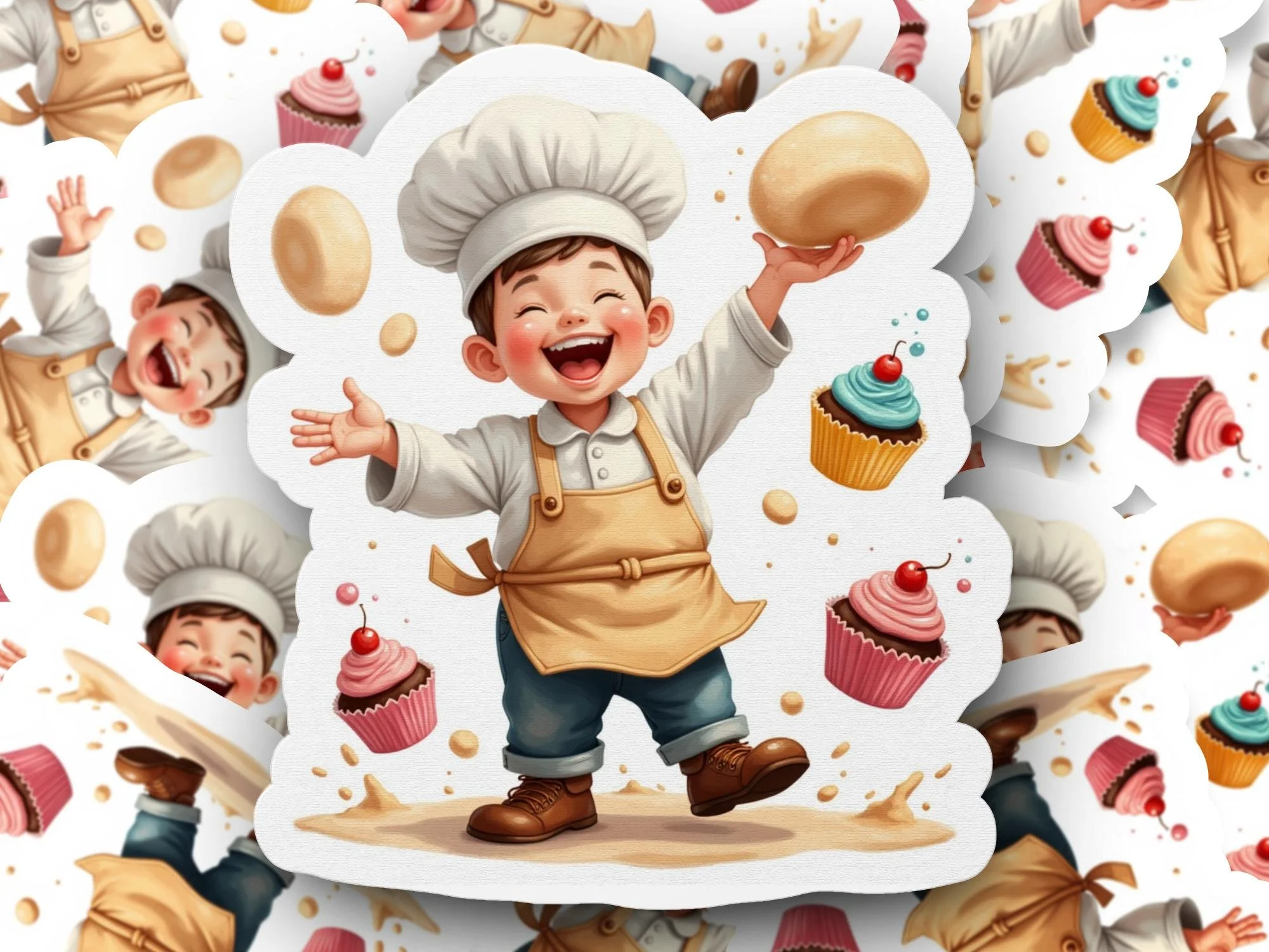 Add a sprinkle of joy to your everyday items with this adorable "Joyful Baker Boy" sticker! This delightful design features a happy young baker surrounded by cupcakes and baking ingredients, perfect for anyone with a sweet tooth or a passion for baking.