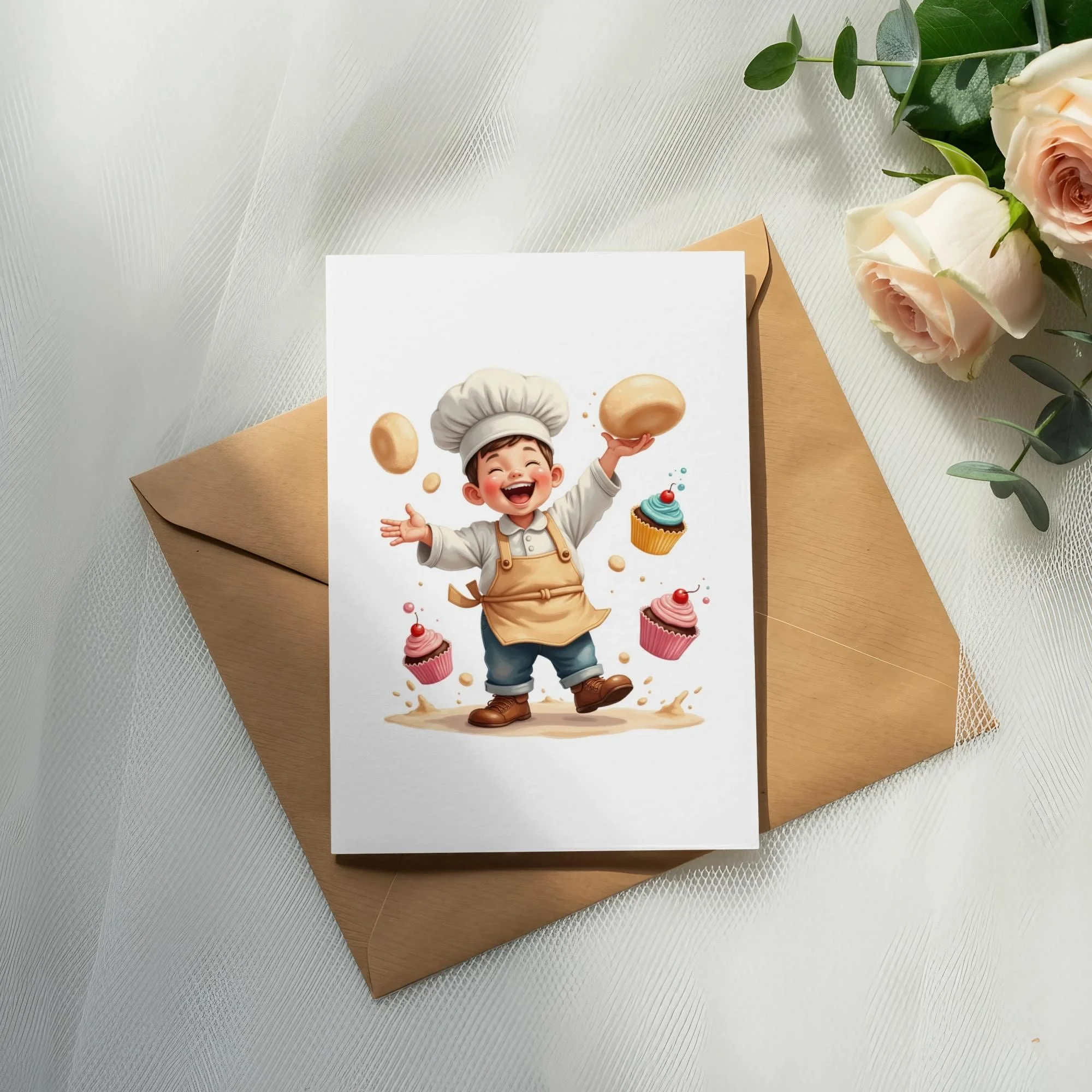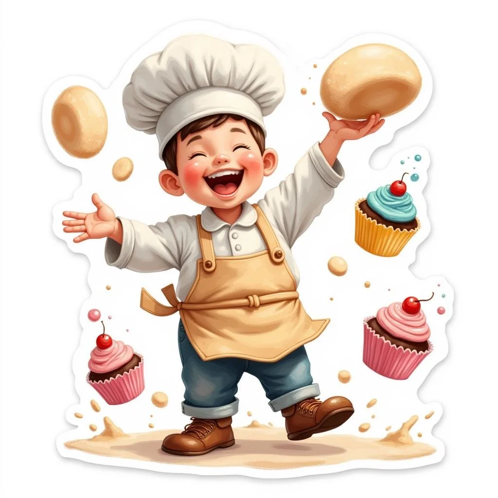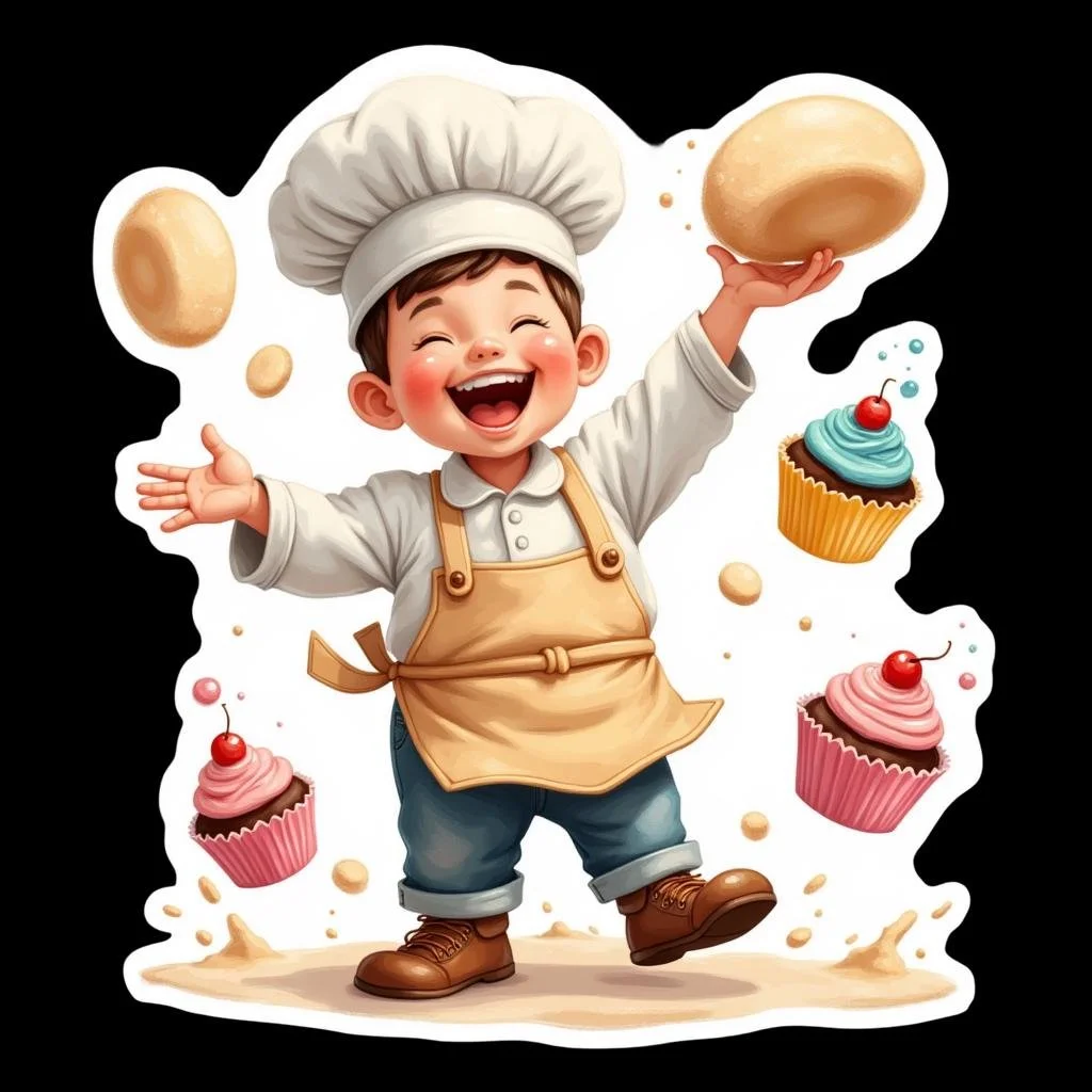 Add a sprinkle of joy to your everyday items with this adorable "Joyful Baker Boy" sticker! This delightful design features a happy young baker surrounded by cupcakes and baking ingredients, perfect for anyone with a sweet tooth or a passion for baking.