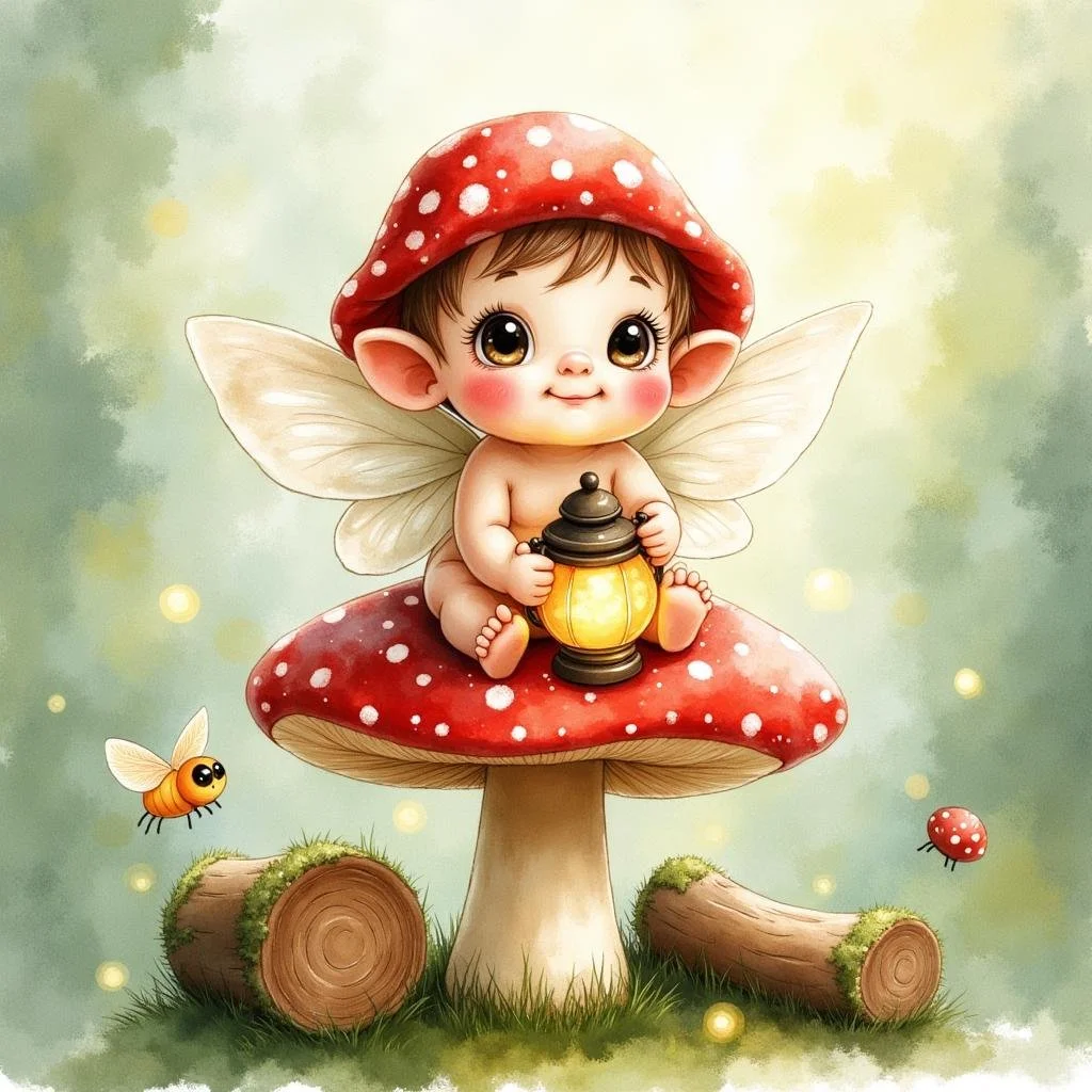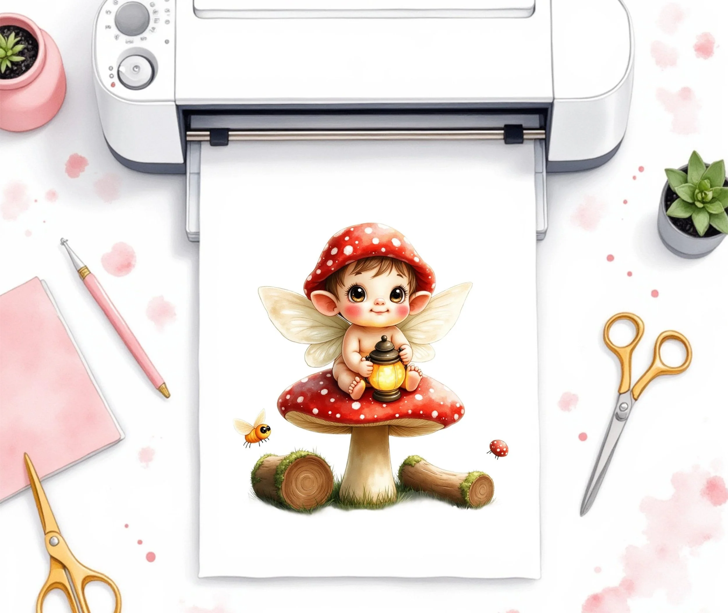 This adorable sticker is perfect for adding a touch of whimsy to your belongings. It features a charming fairy baby sitting on a red mushroom. The fairy is holding a glowing lantern. This enchanting design will add a touch of magic to anything. Perfect for personalizing your belongings. Add some fantasy to your laptop, water bottle, or notebook. A unique and eye catching design. Great gift for fairy lovers.