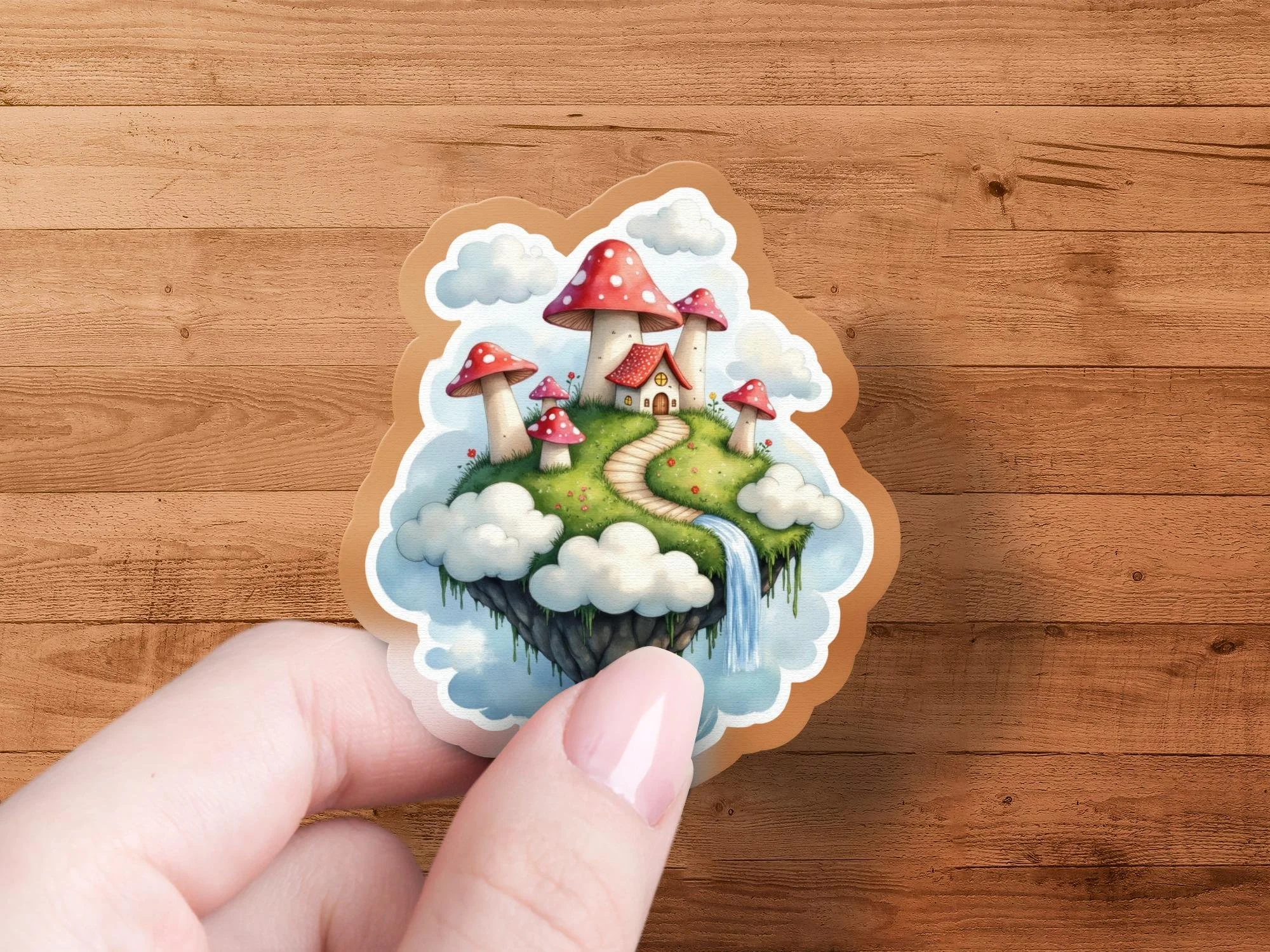 This whimsical sticker brings a touch of fantasy to your everyday items. The design features a charming mushroom house nestled on a floating island, complete with a winding path, vibrant flowers, and a cascading waterfall. Perfect for adding a touch of magic to laptops, water bottles, notebooks, and more. This eye-catching sticker is sure to spark joy and conversation wherever you go.