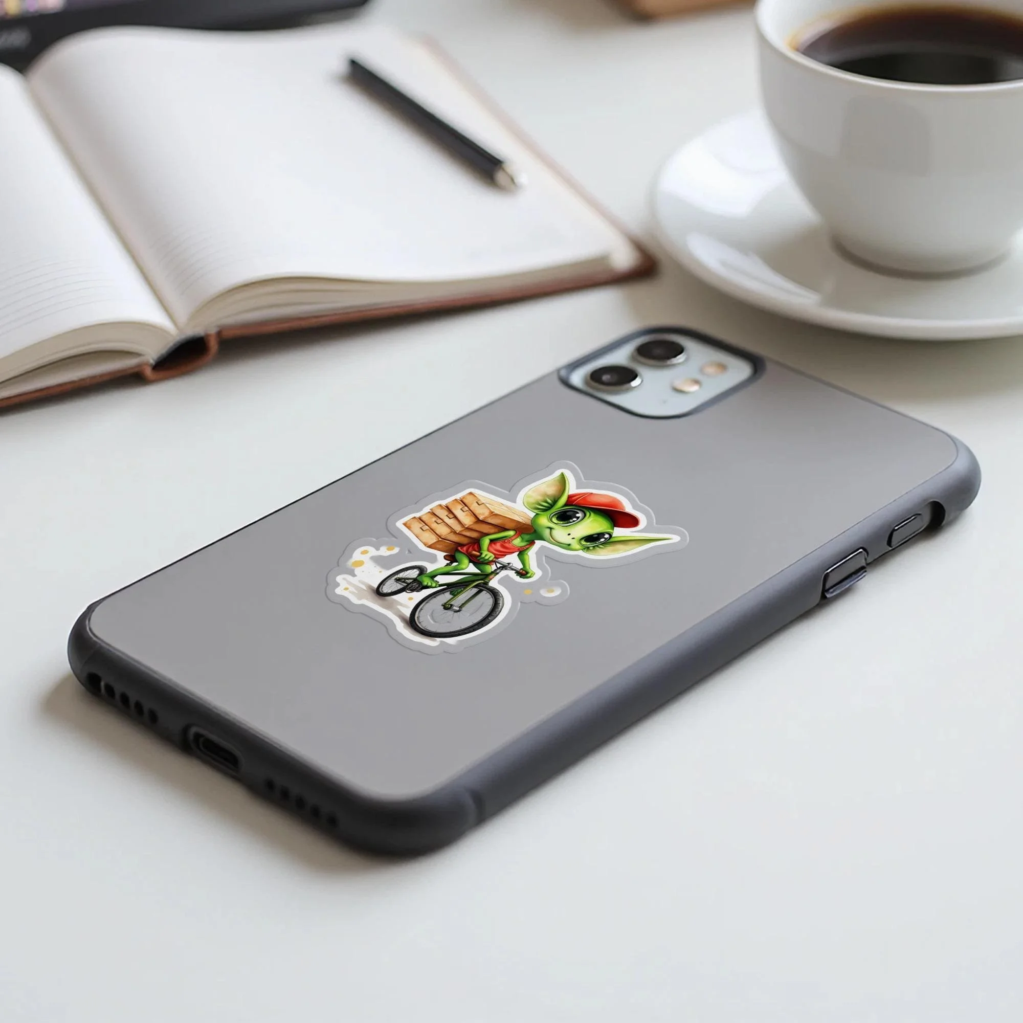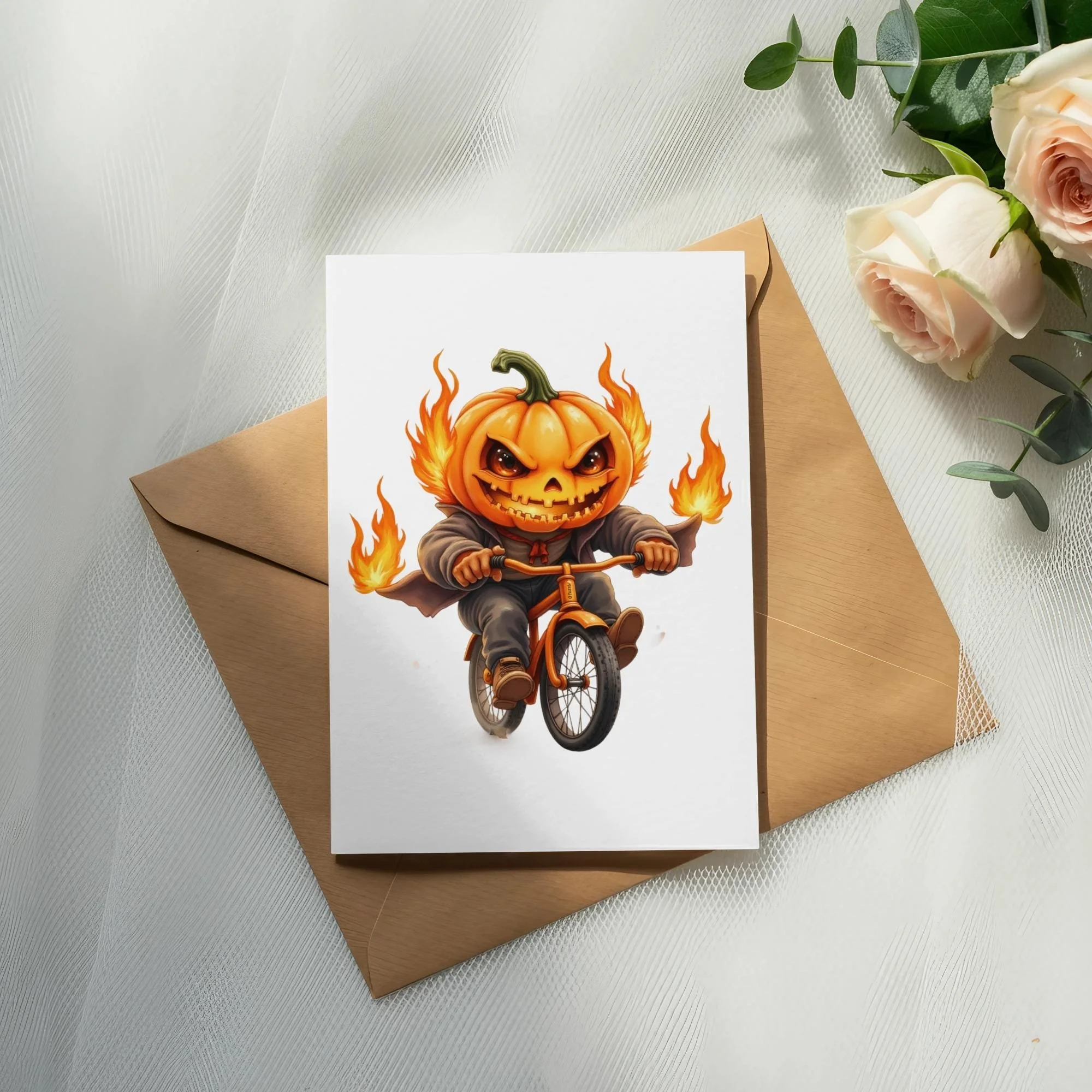 This unique sticker is perfect for personalizing your belongings. It features a detailed pumpkin character on a bicycle. The pumpkin head is adorned with flames. This design adds a spooky and funny vibe. Great for laptops, water bottles, and notebooks. A unique and eye catching design for all. Ideal gift for Halloween or Fall lovers.