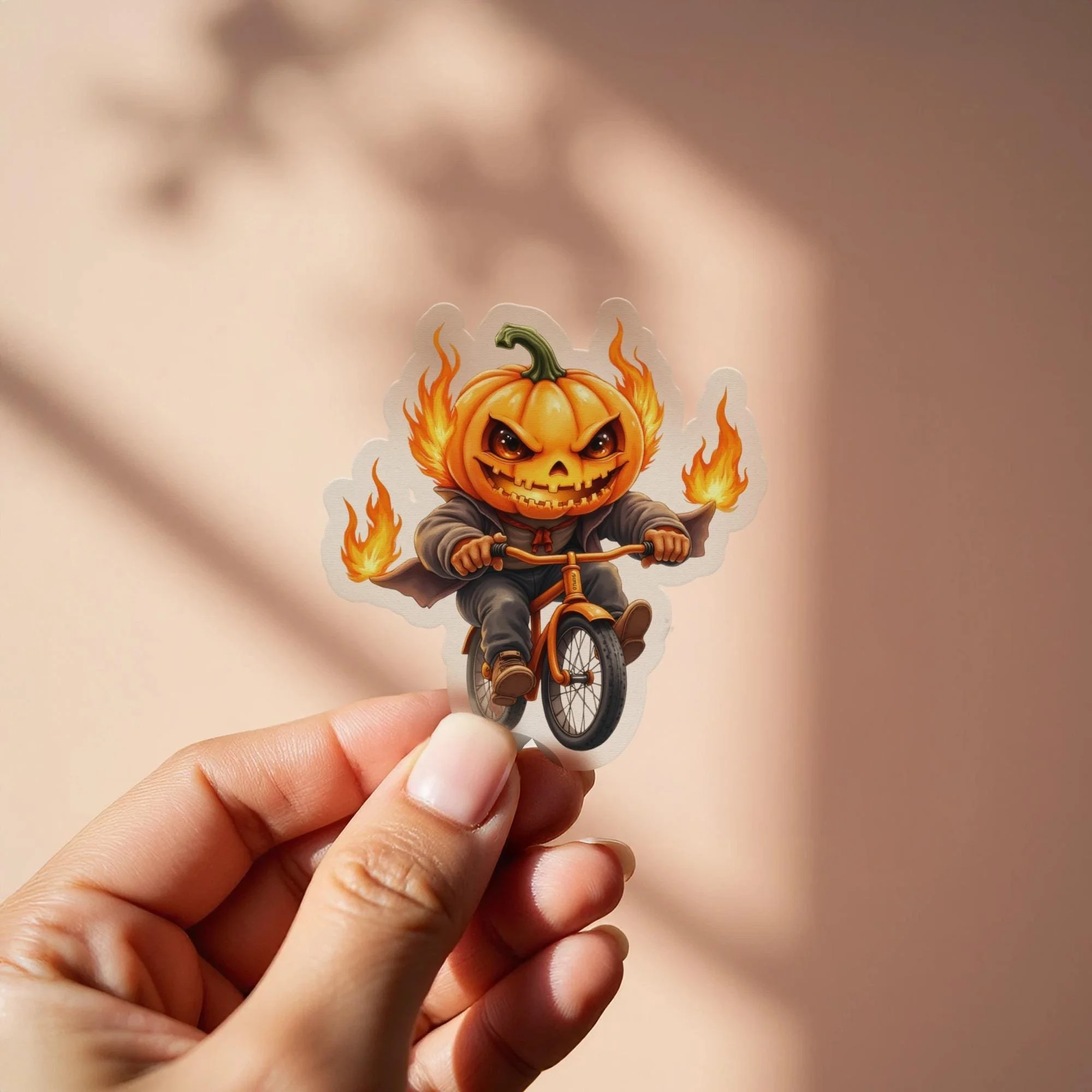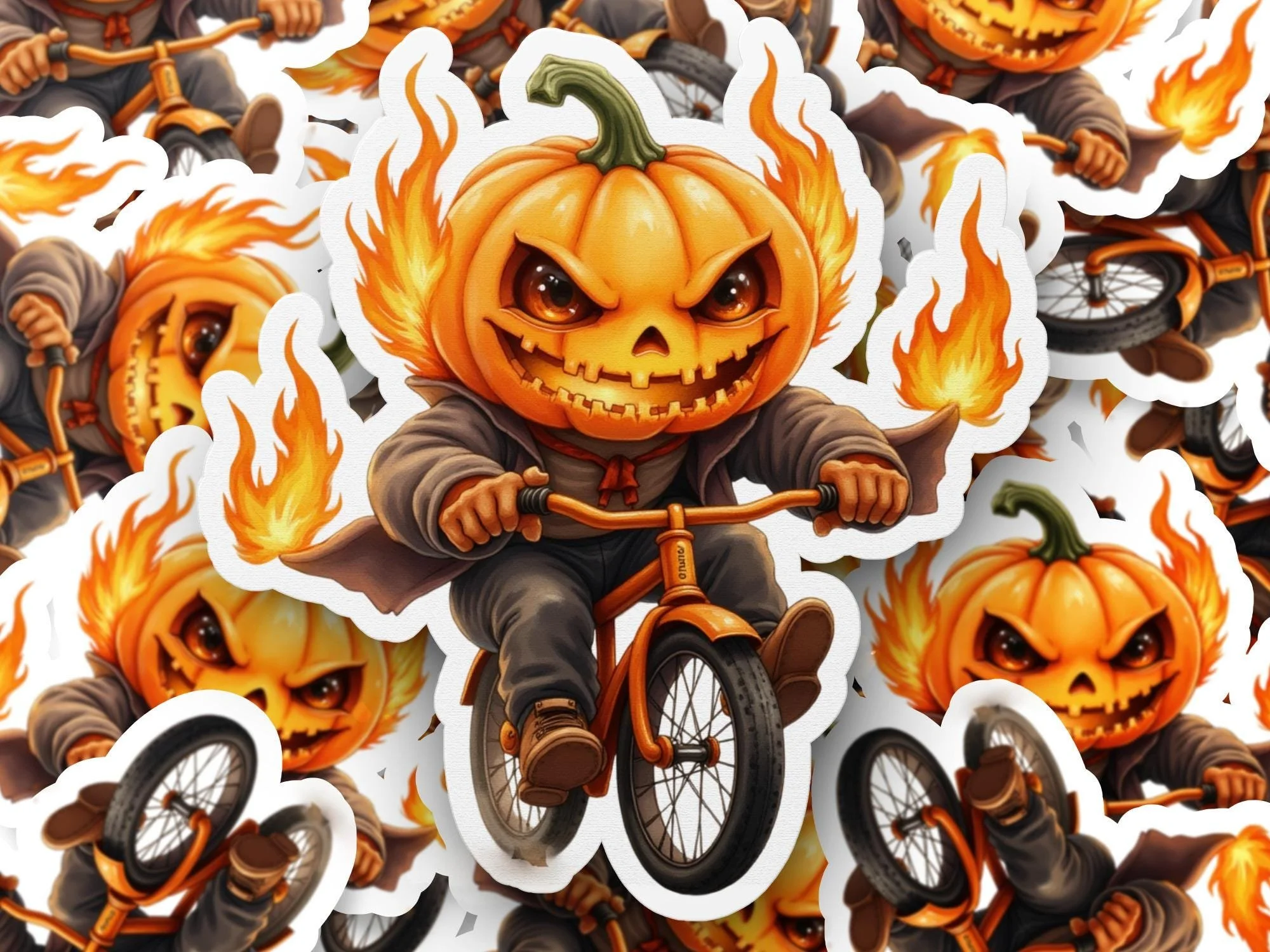 Add a fun and spooky touch to your belongings with this "Pumpkin Head" sticker. This unique design features a cute pumpkin headed character riding a bike with flames. Perfect for those who appreciate the fun side of Halloween.