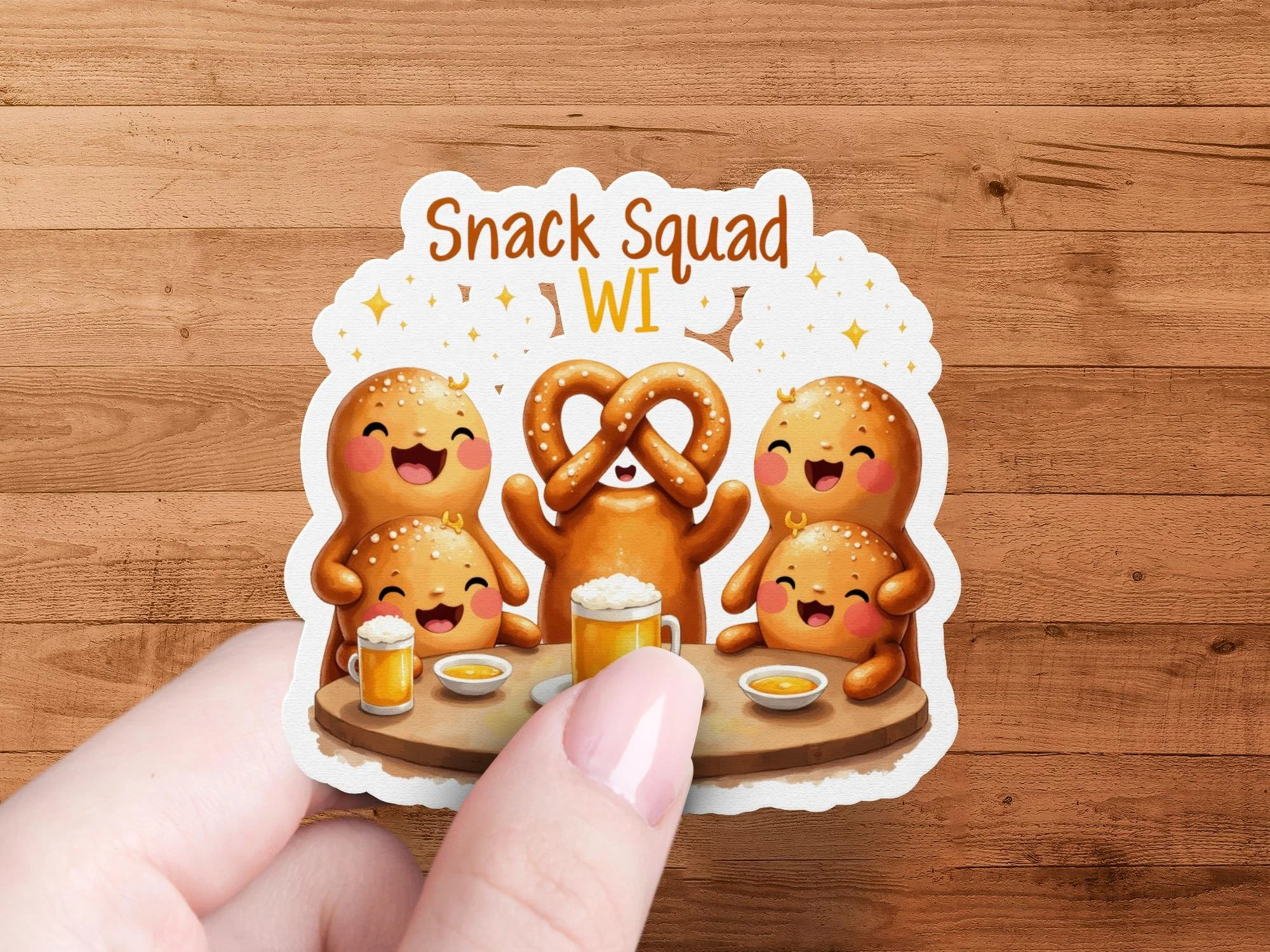 Snack Squad Sticker, Wisconsin Food, Pretzel, Beer, Cute Foodie, Funny Stickers, WI Pride, Midwest Gift, Travel Souvenir, Cartoon Food