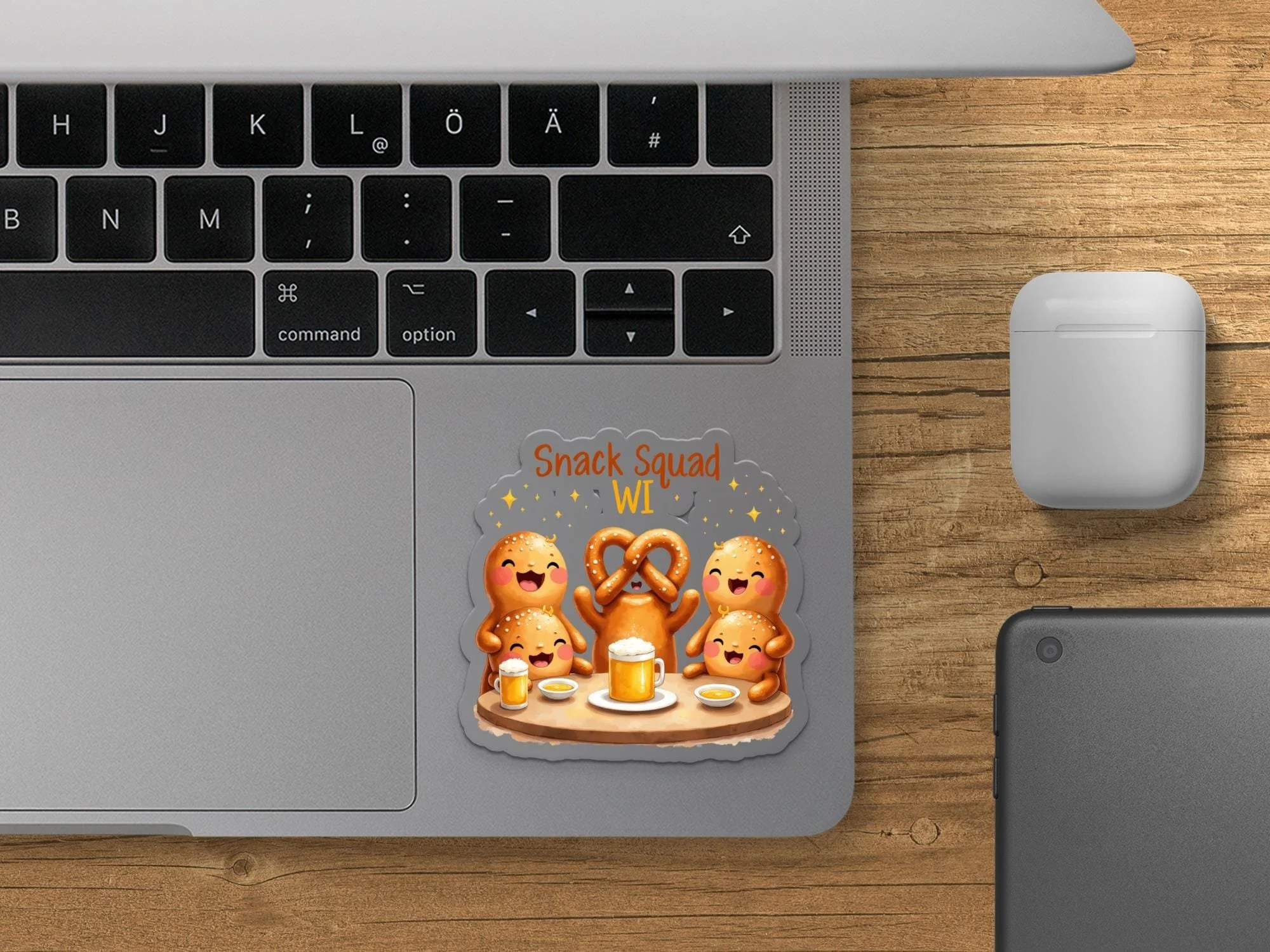 This adorable "Snack Squad WI" sticker is perfect for showing off your Wisconsin pride and love for delicious snacks. Featuring a group of happy pretzel characters enjoying beer, this sticker adds a touch of humor and cuteness to any surface. Ideal for decorating laptops, water bottles, notebooks, and more. A great gift for foodies, beer lovers, or anyone who loves Wisconsin.