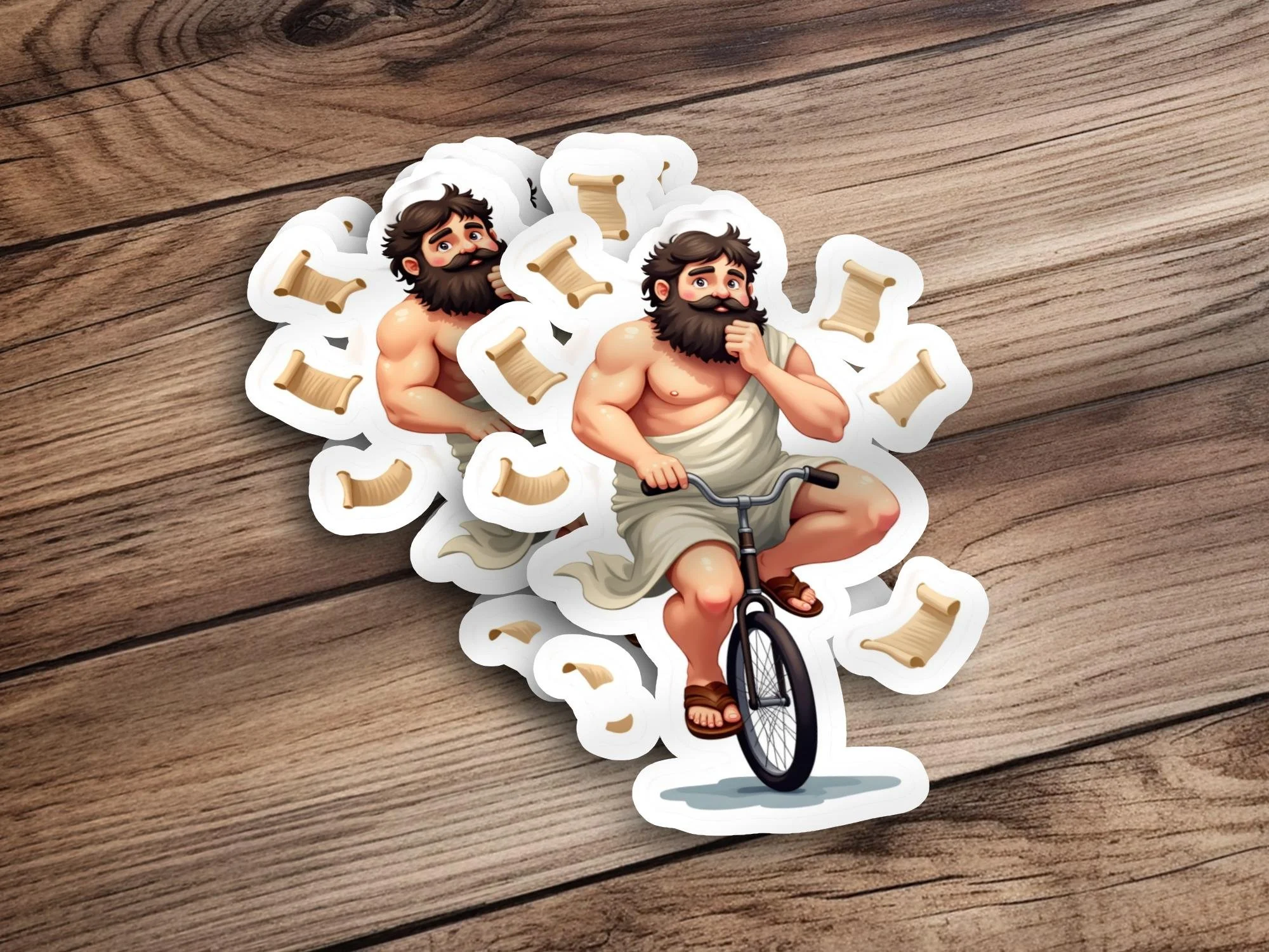 Add a touch of philosophical humor to your world with this "Socrates on a Unicycle" sticker! This unique design features the iconic Greek philosopher, Socrates, riding a unicycle while contemplating life amidst floating scrolls. It is sure to spark conversations and bring a smile to anyone's face.