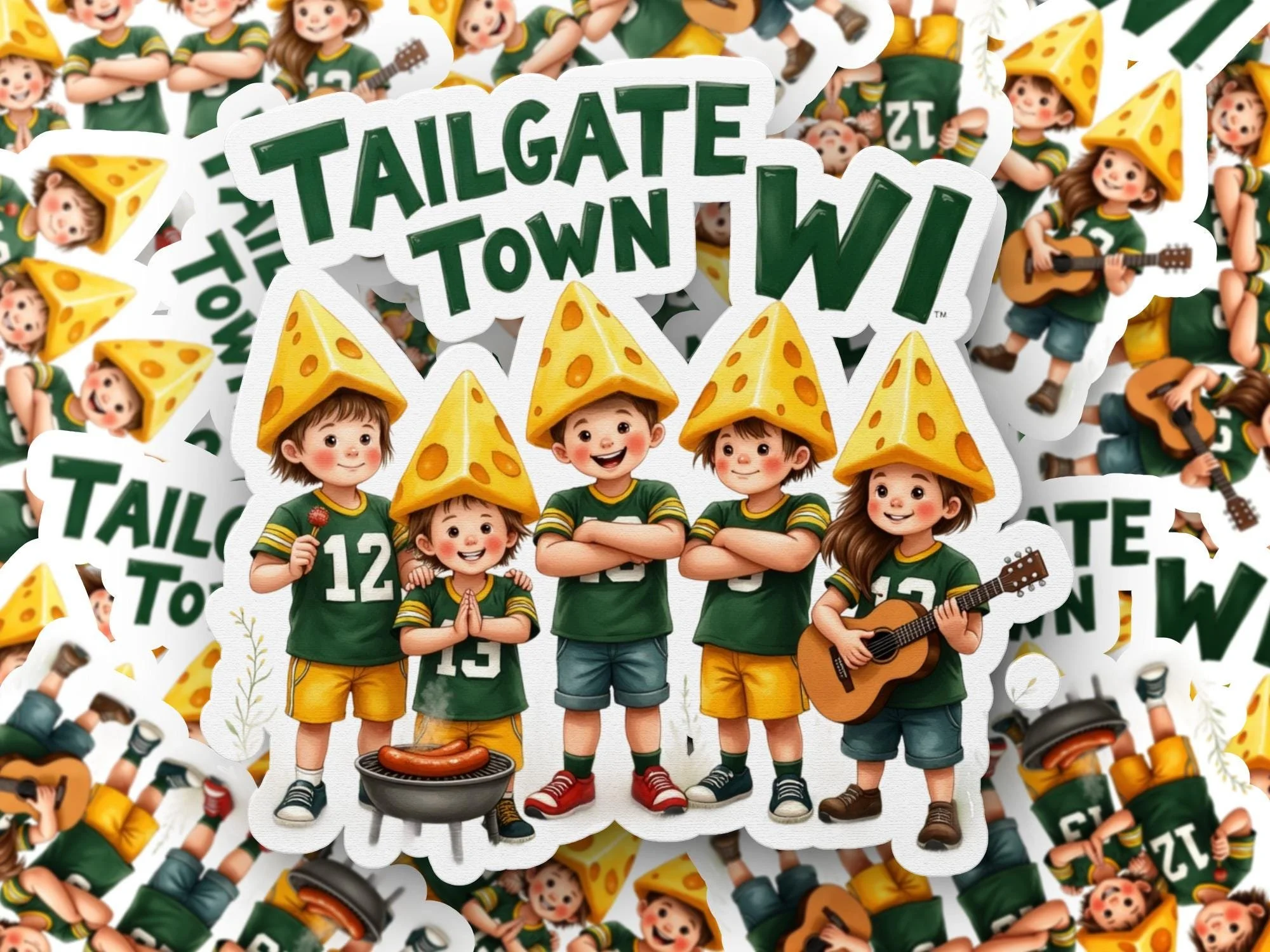 Show your Wisconsin pride with this fun "Tailgate Town WI" sticker. This adorable design features cartoon kids wearing cheesehead hats and football jerseys, ready for game day. Perfect for decorating your laptop, water bottle, or car, this sticker is a great way to display your love for Wisconsin football.