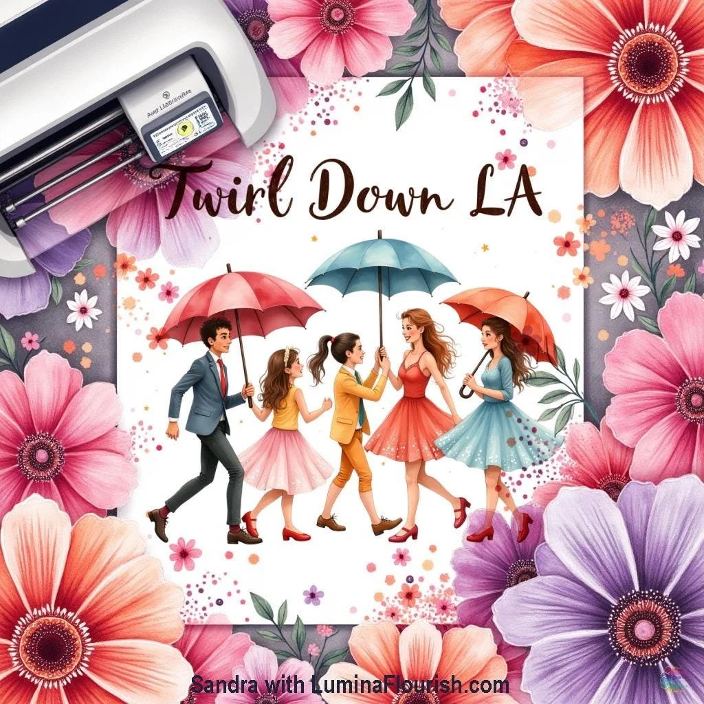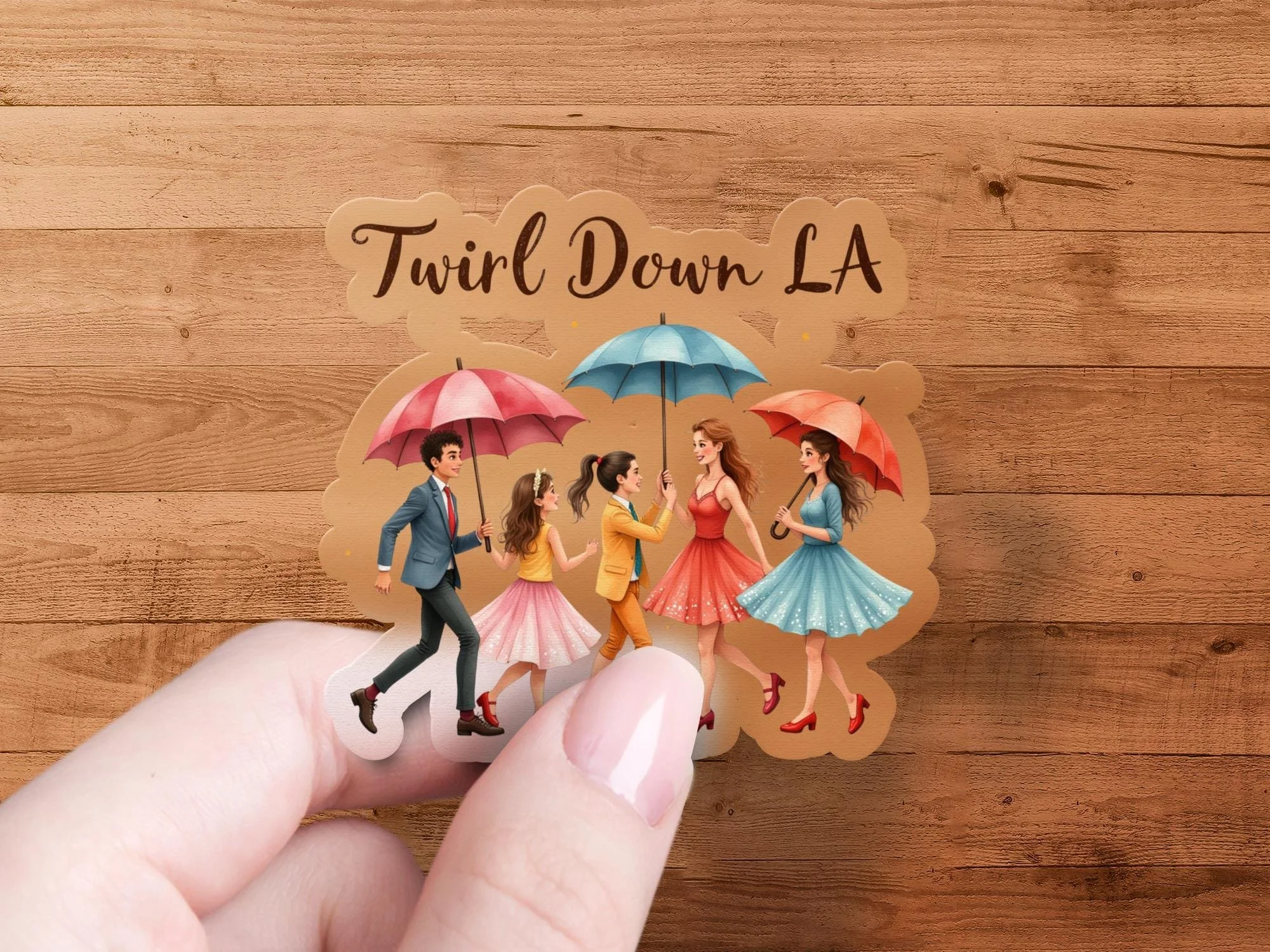 This unique sticker is perfect for personalizing your belongings. It features a vibrant scene of people walking with umbrellas. "Twirl Down LA" is written stylishly at the top of the design. Perfect for adding a cheerful and artistic touch. This design adds a playful yet elegant vibe. Great for laptops, water bottles, and notebooks. A unique and eye catching design for all. Ideal gift for people who love illustrations.