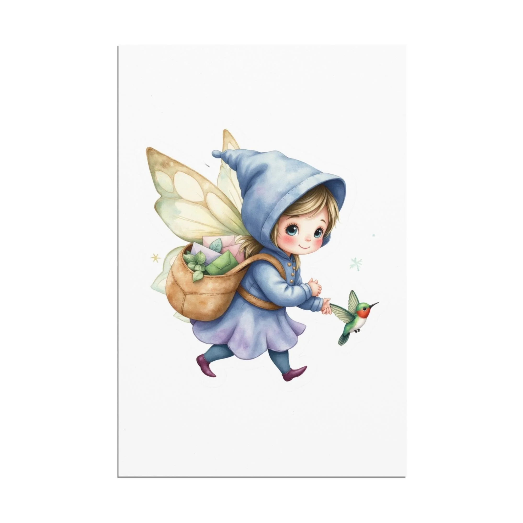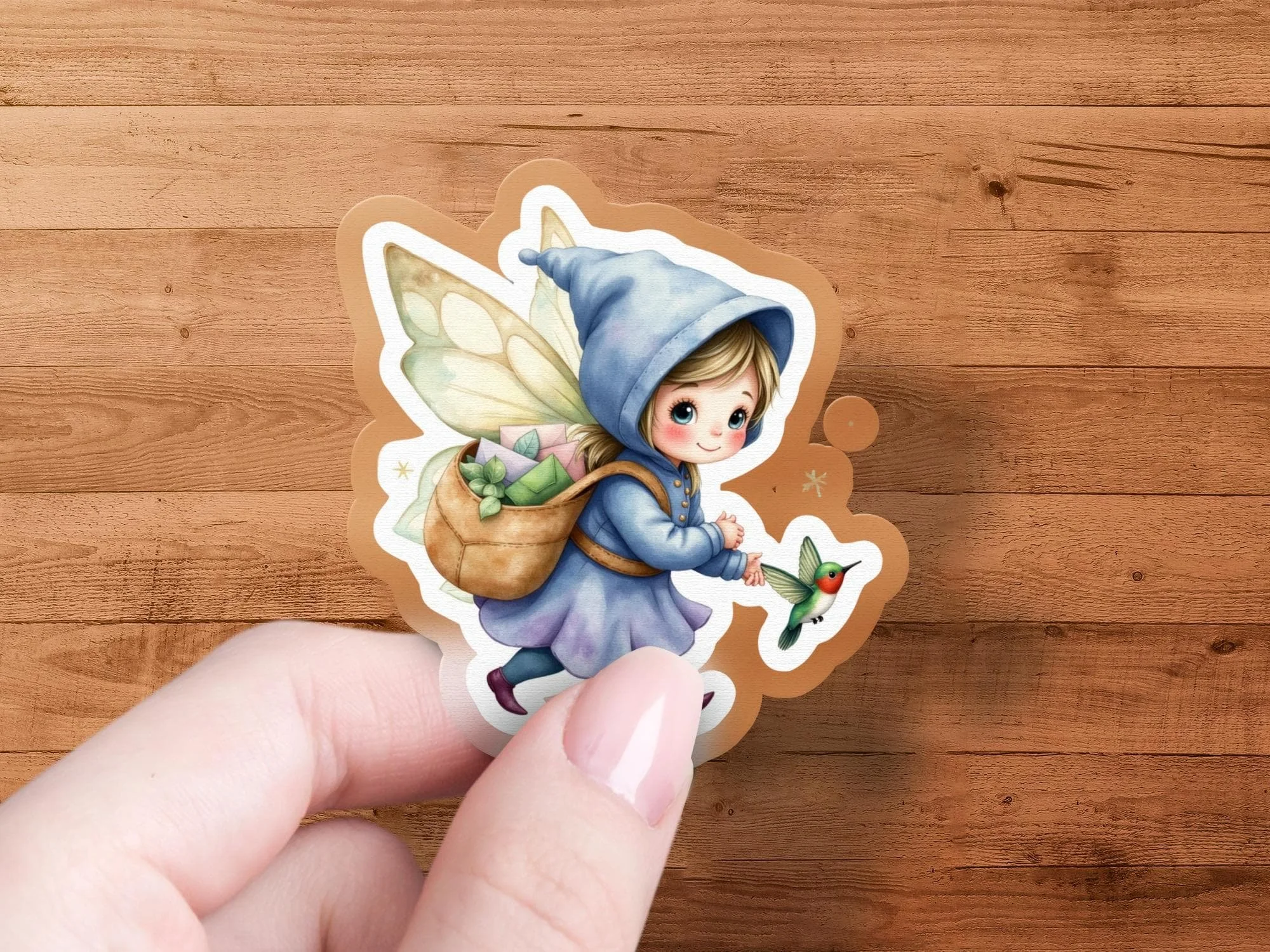 Add a touch of magic to your life with this adorable fairy sticker! This unique design features a sweet fairy girl dressed in blue, acting as a post girl. She carries a satchel full of letters and is accompanied by a charming hummingbird. Perfect for adding a whimsical touch to any surface.