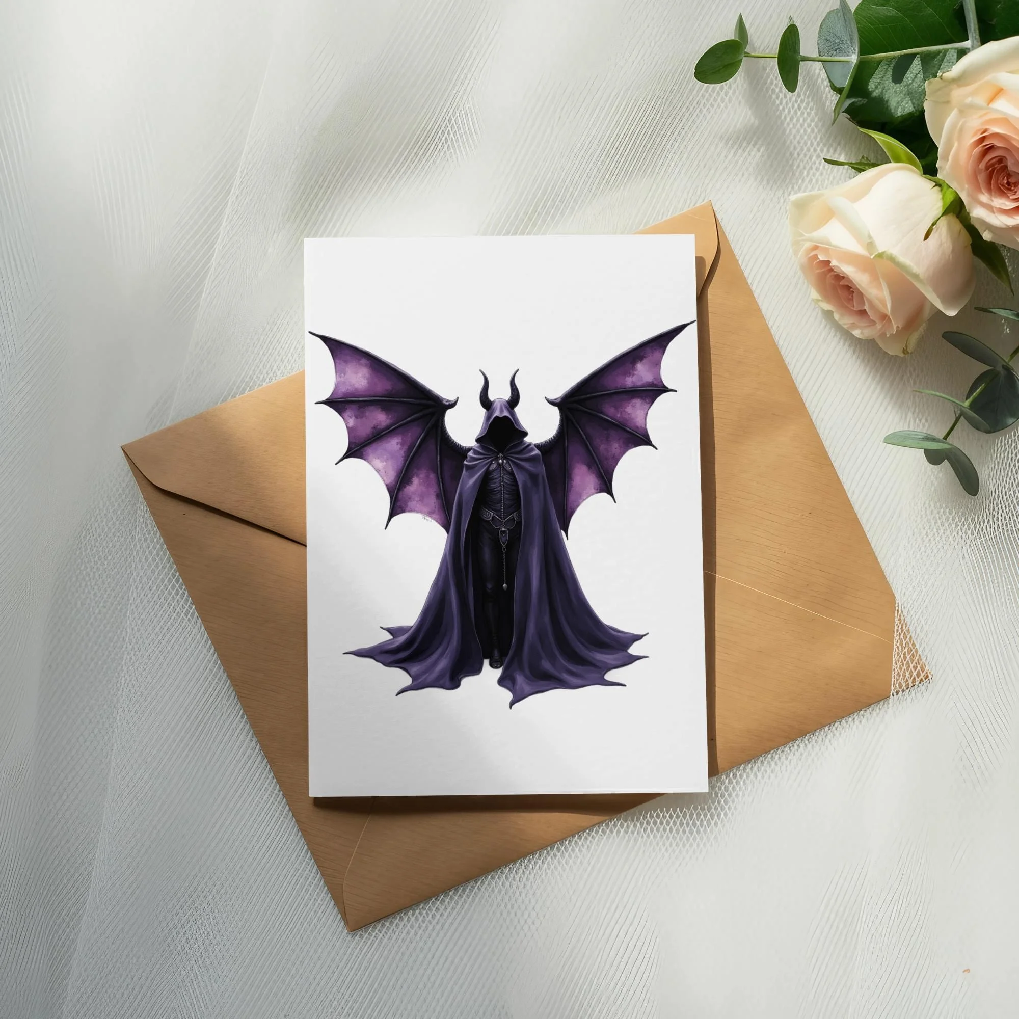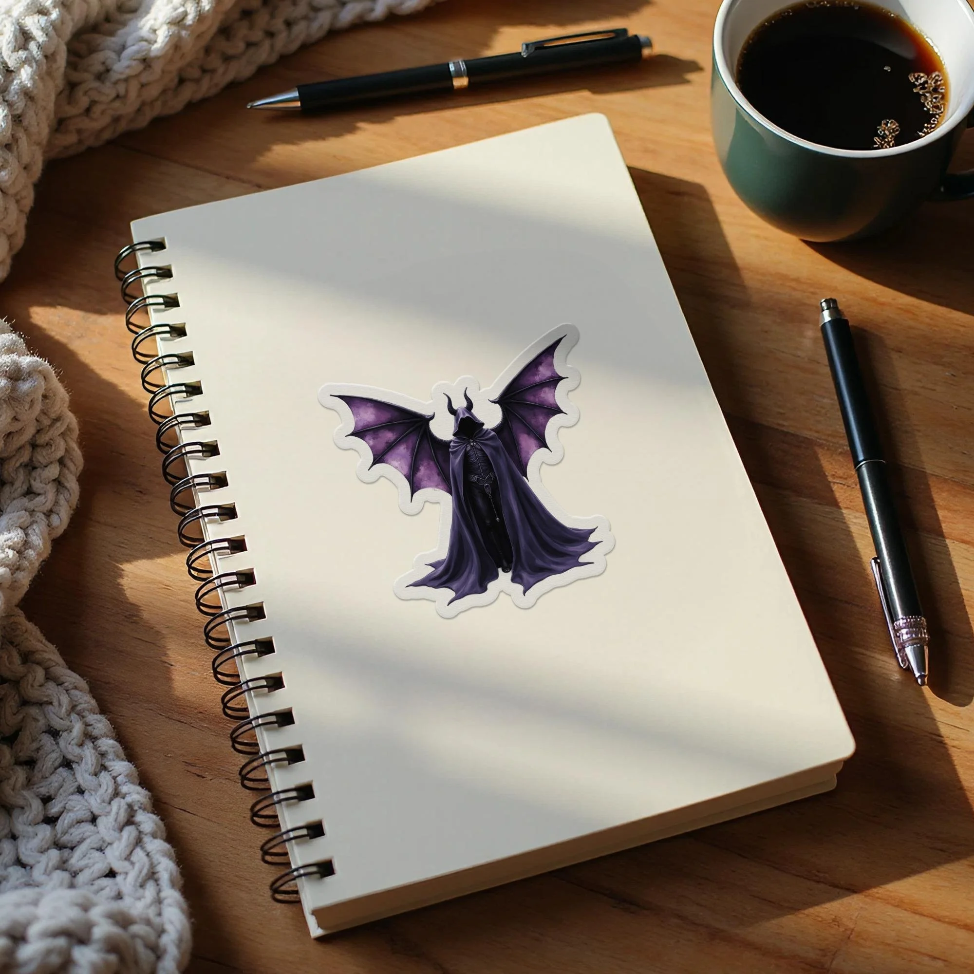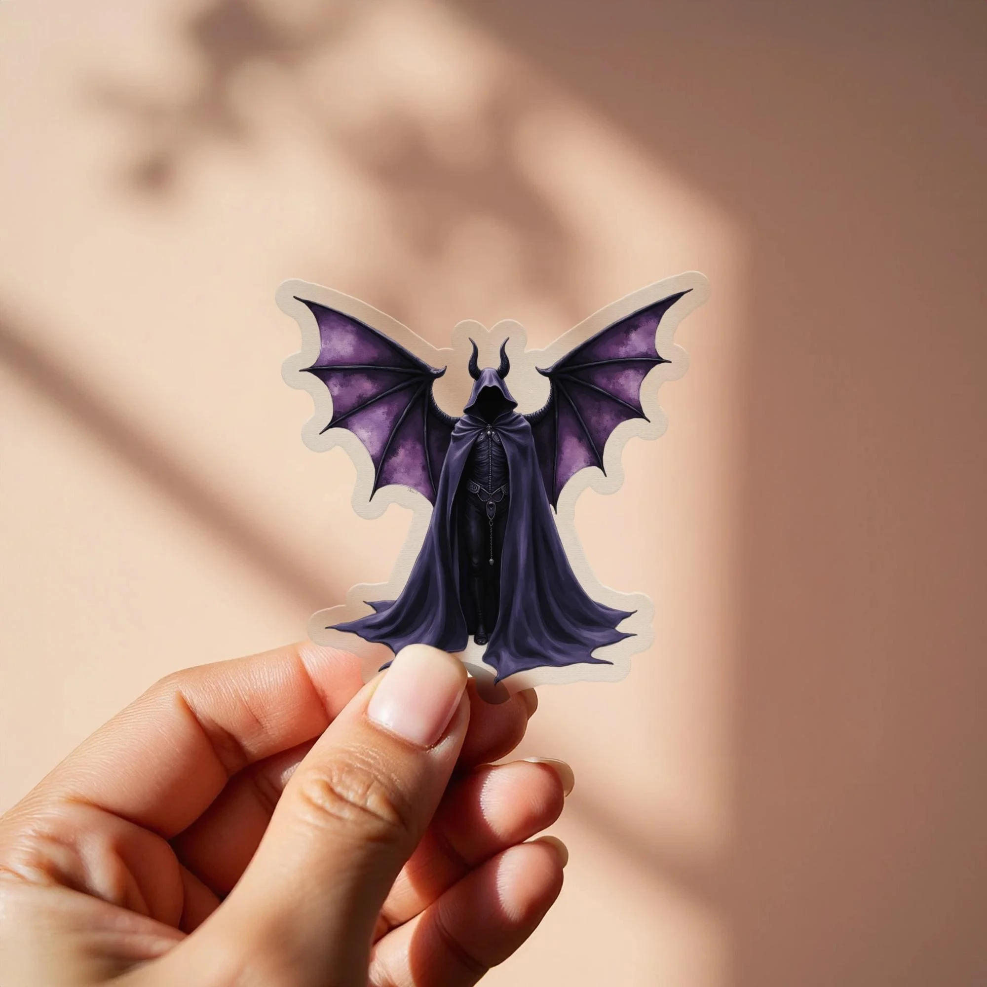 This unique sticker is ideal for adding personality to any surface. It showcases a detailed creature with large, textured wings. The figure has a hooded cloak and prominent horns. The dark purple color palette enhances the gothic aesthetic. Perfect for laptops, water bottles, and notebooks. Great for horror fans and fantasy enthusiasts. Makes an eye catching statement. An excellent gift for lovers of dark art.