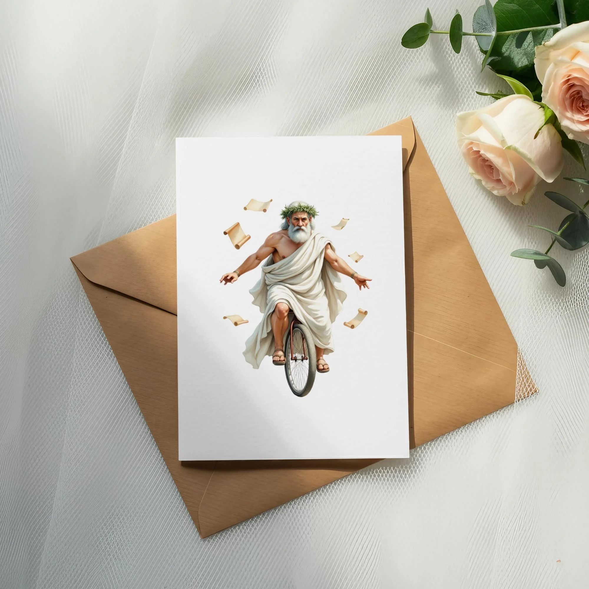 Add a touch of whimsy and mythology to your belongings with this Zeus on a Unicycle sticker. This unique design features the mighty Zeus, king of the gods, sporting a laurel wreath and toga, gracefully riding a unicycle amidst floating scrolls. A perfect conversation starter, this sticker adds a dash of humor and intelligence to any surface.