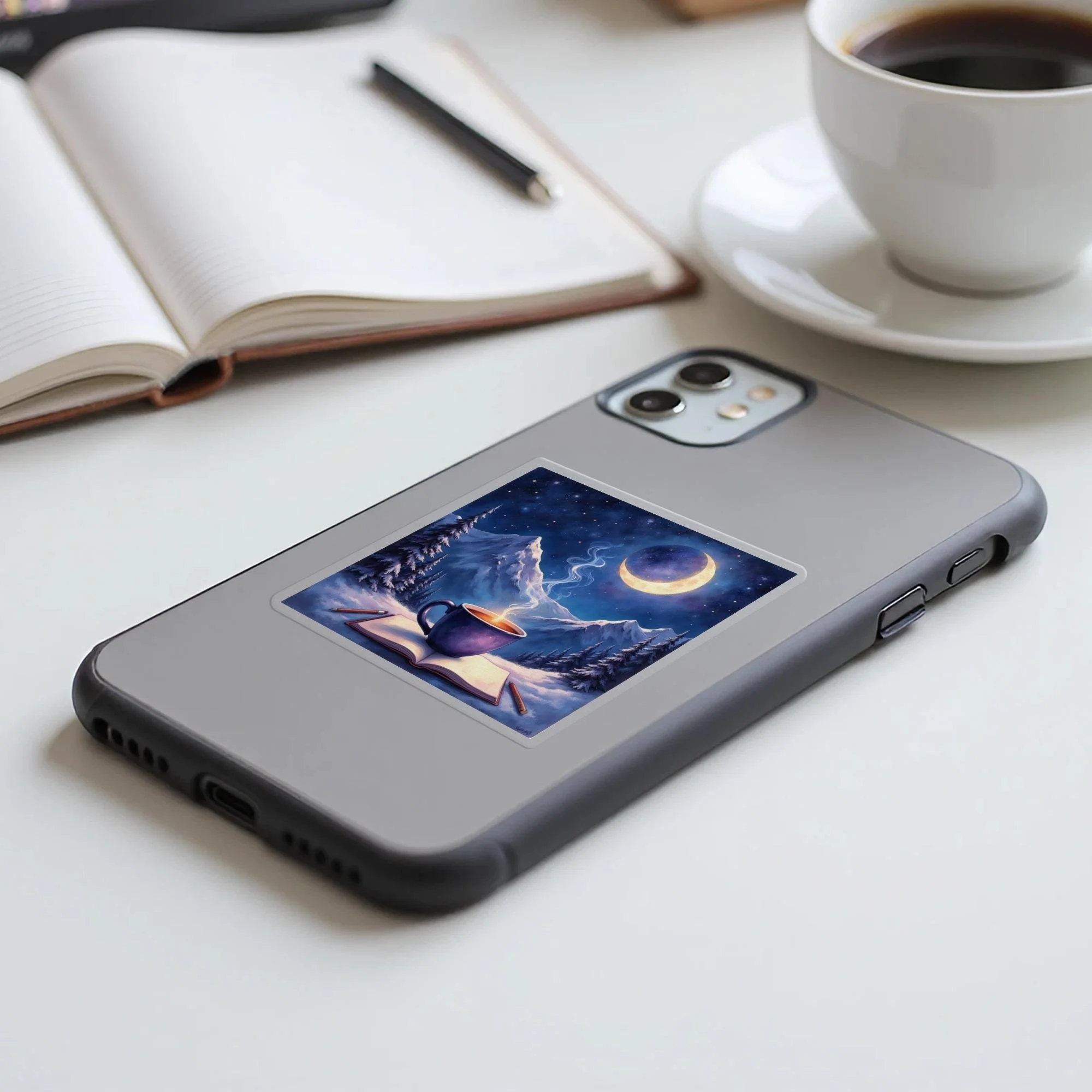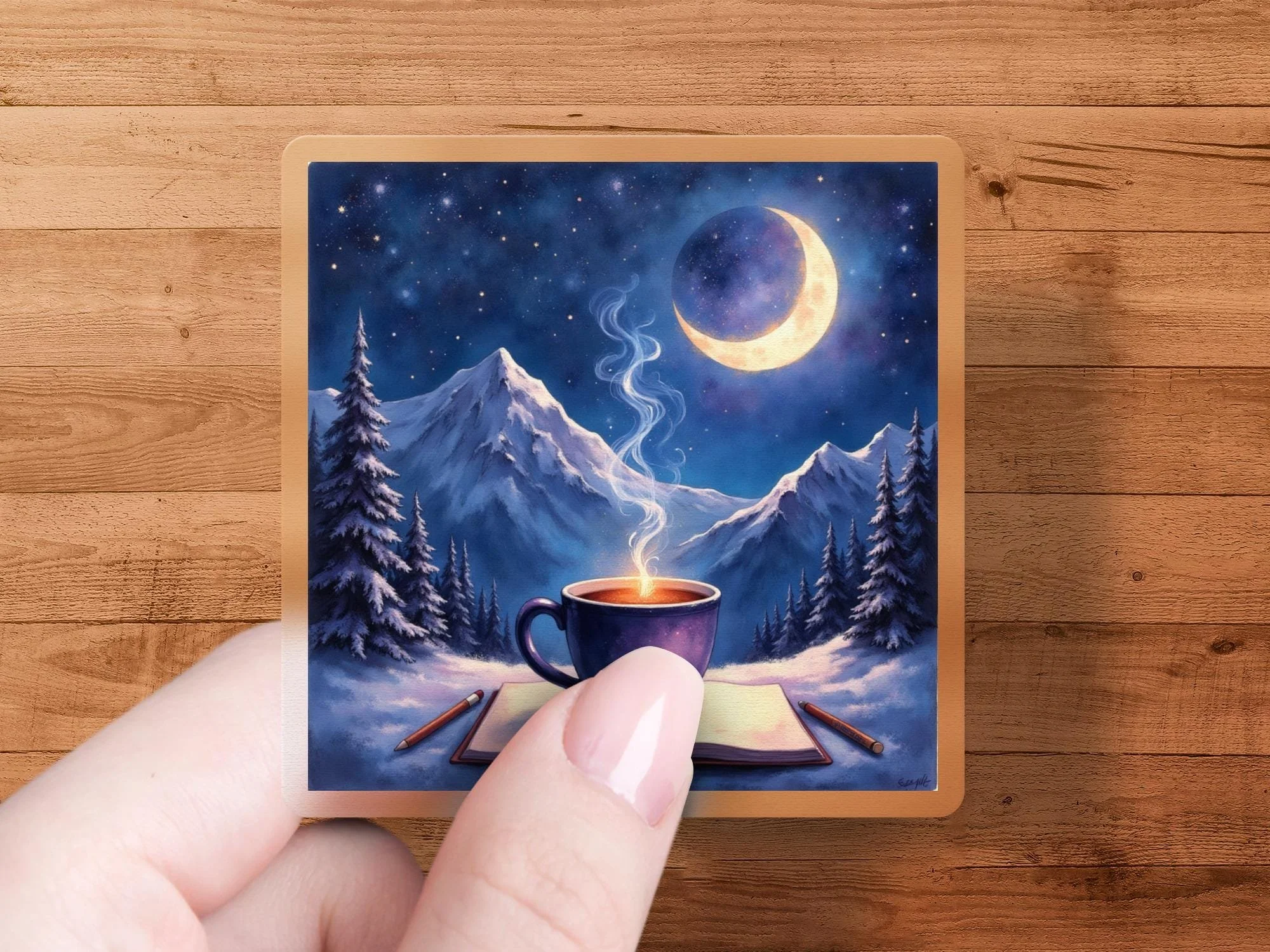 Idaho Winter Night Sticker, Cozy Coffee, Book, Snowy Mountains, Moon Sticker, Nighttime Sticker, Reading Sticker, Writer Sticker