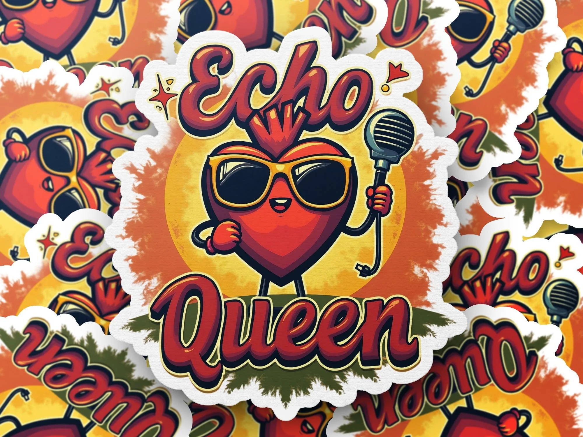 Adorn your world with the "Echo Queen" sticker! This unique design features a cartoon heart wearing sunglasses and holding a microphone, embodying the spirit of a musical star. Perfect for adding a touch of fun and personality to your everyday items.