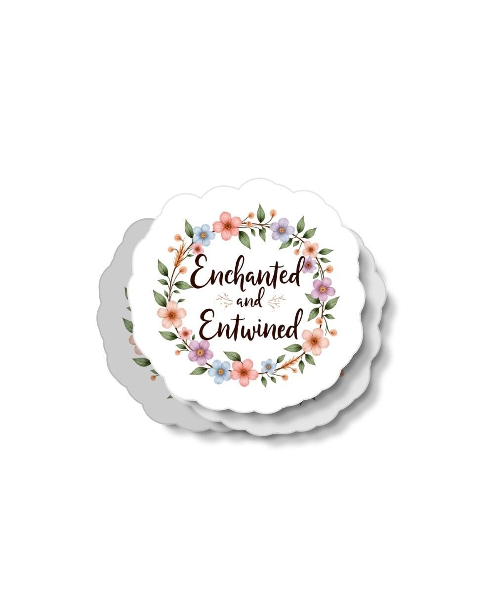 This sticker showcases the phrase "Enchanted and Entwined" in elegant script.