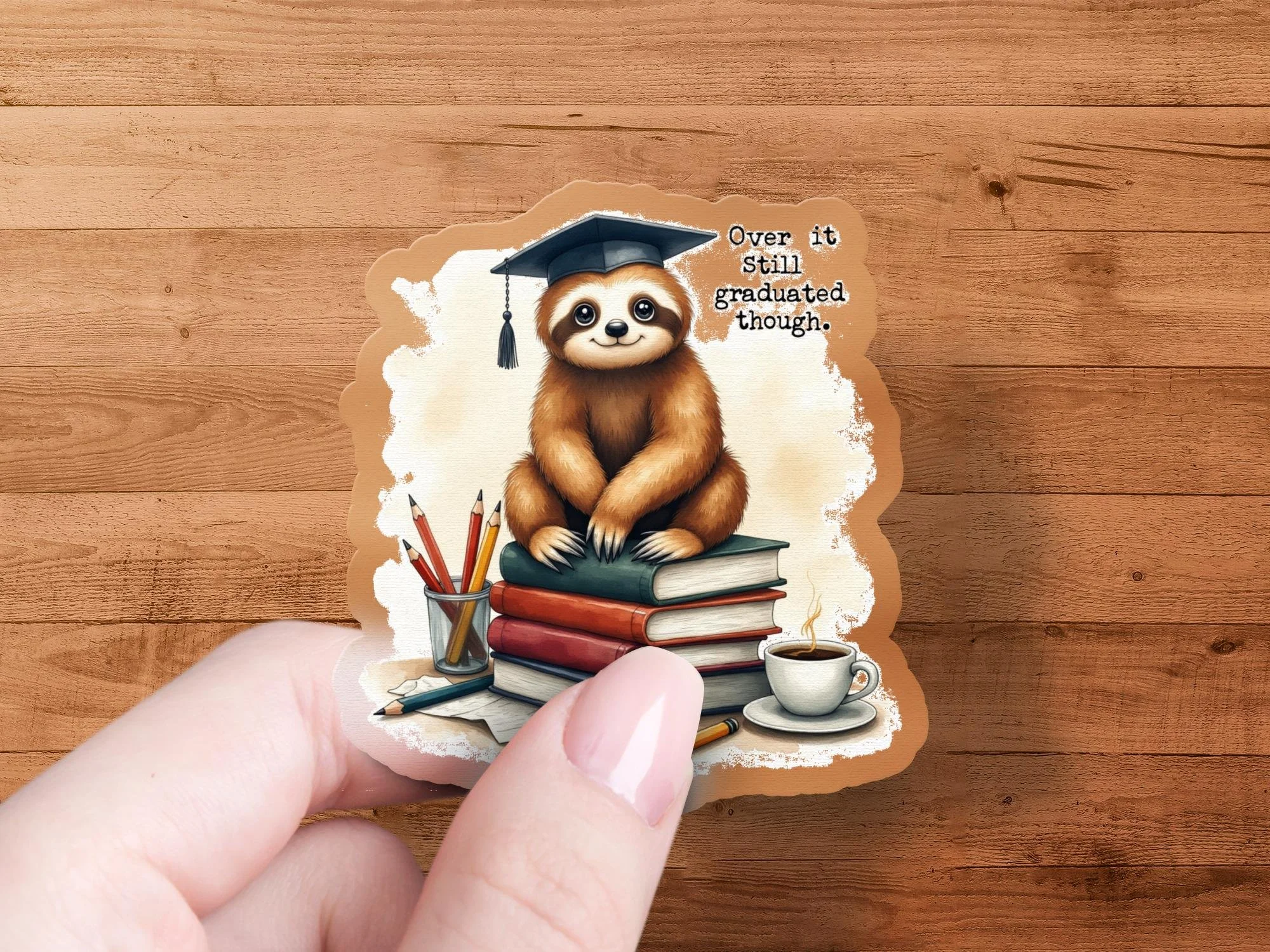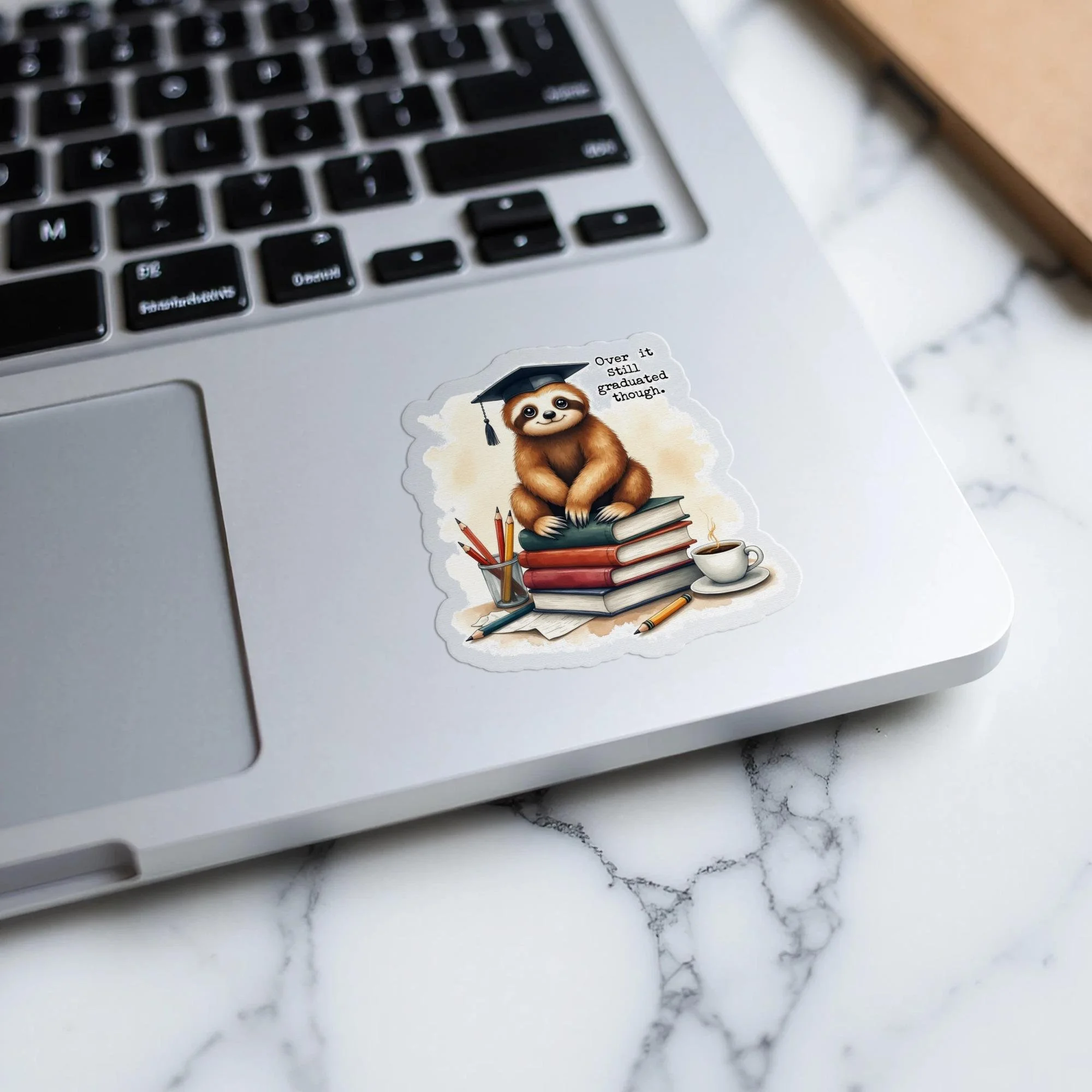 Elevate your belongings with this one of a kind "Graduation Sloth" sticker! This design features a cute sloth wearing a graduation cap, sitting on a stack of books with coffee and pencils nearby and the saying "Over it still graduated though.". This design adds a touch of personality and humor to your laptop, water bottle, notebook, or any other surface that needs a touch of fun.