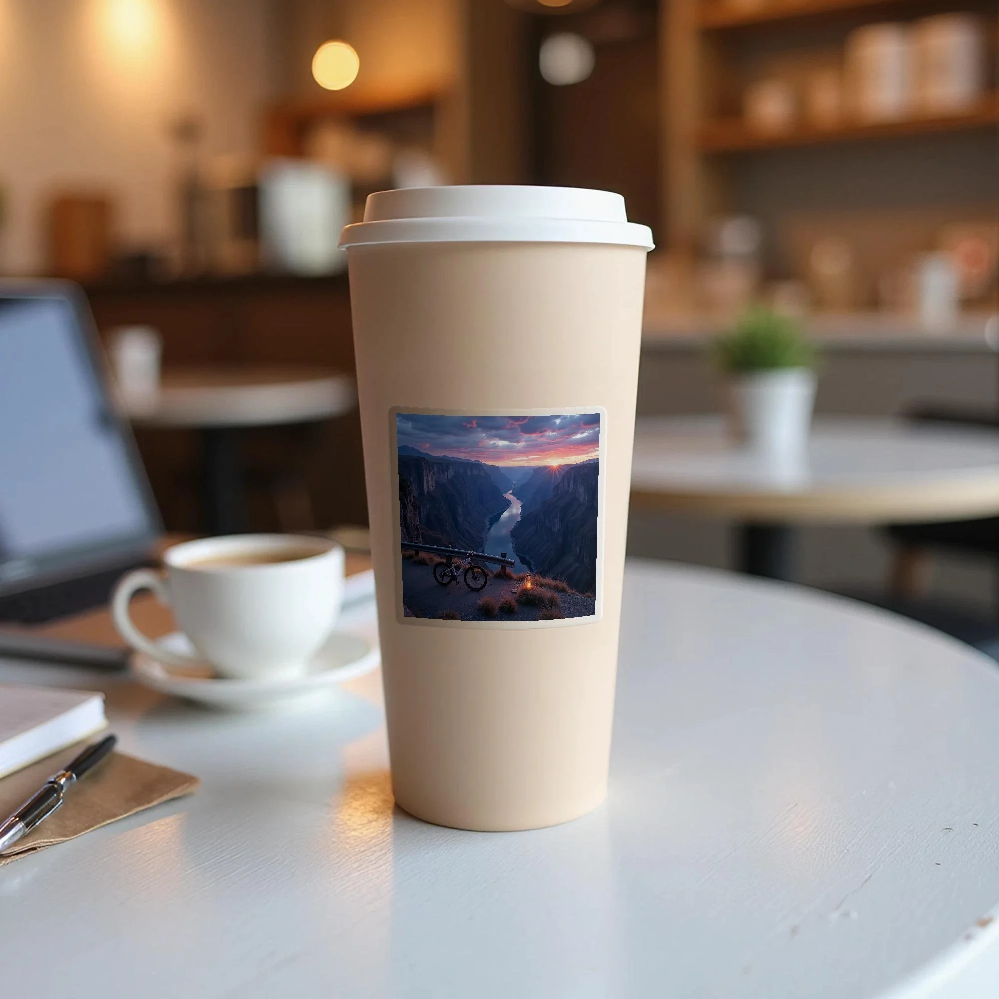 Add the beauty of Idaho to your everyday items with this stunning canyon sticker. Featuring a picturesque scene of a mountain bike overlooking a breathtaking river canyon at sunset, this sticker captures the essence of adventure and natural beauty. The pink and purple hues of the sky create a serene and captivating atmosphere, making it a perfect addition to your laptop, water bottle, or notebook.