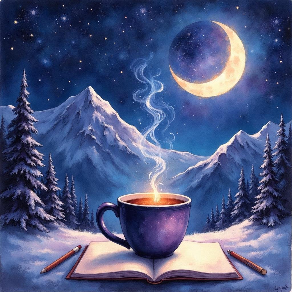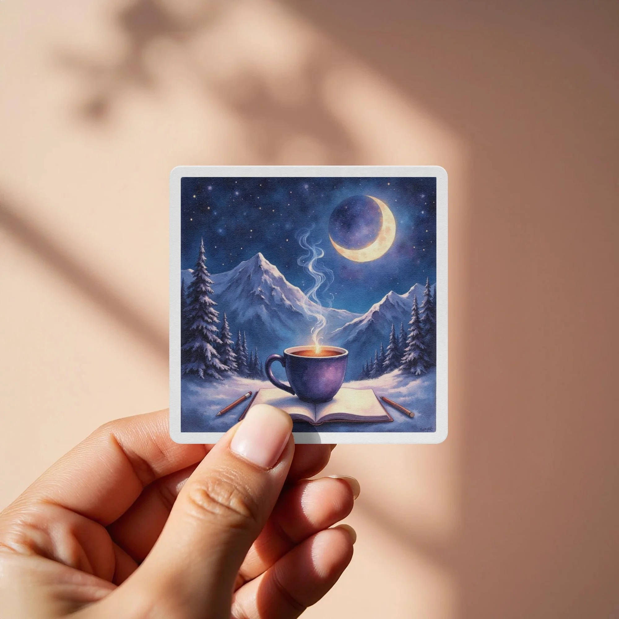 Add a touch of magical winter vibes to your belongings with this "Winter Night Coffee" sticker. This enchanting design features a steaming mug of coffee set atop an open book, with snowy mountains, pine trees, and a crescent moon under a starry sky in the background. It evokes a sense of warmth, creativity, and peaceful reflection amidst a winter landscape. Perfect for adding a cozy and whimsical touch to your laptop, water bottle, notebook, or any other surface.