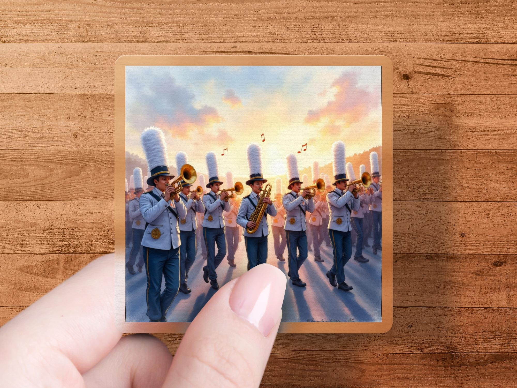 This unique sticker is great for personalizing your belongings. It showcases a vibrant marching band in action. The design features detailed musicians with their instruments. It adds a musical and spirited vibe to any surface. Perfect for laptops, water bottles, and notebooks. Ideal gift for musicians or band enthusiasts.